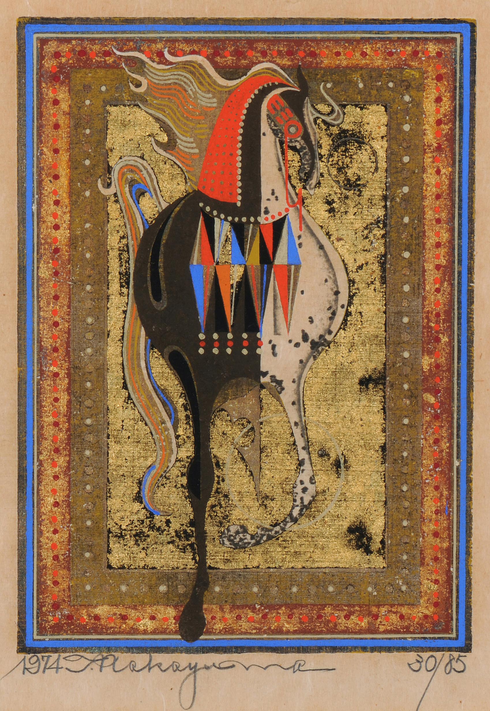 "Ema". 1974. Farbholzschnitt, Sosaku-Hanga. 30/85. Unten mit Bleistift datiert, signiert und nummeriert. Verso Nakayama auf Japanisch mit rotem Siegel. Rand mit Verfärbung. Blattgrösse 34x25 cm. Gerahmt.