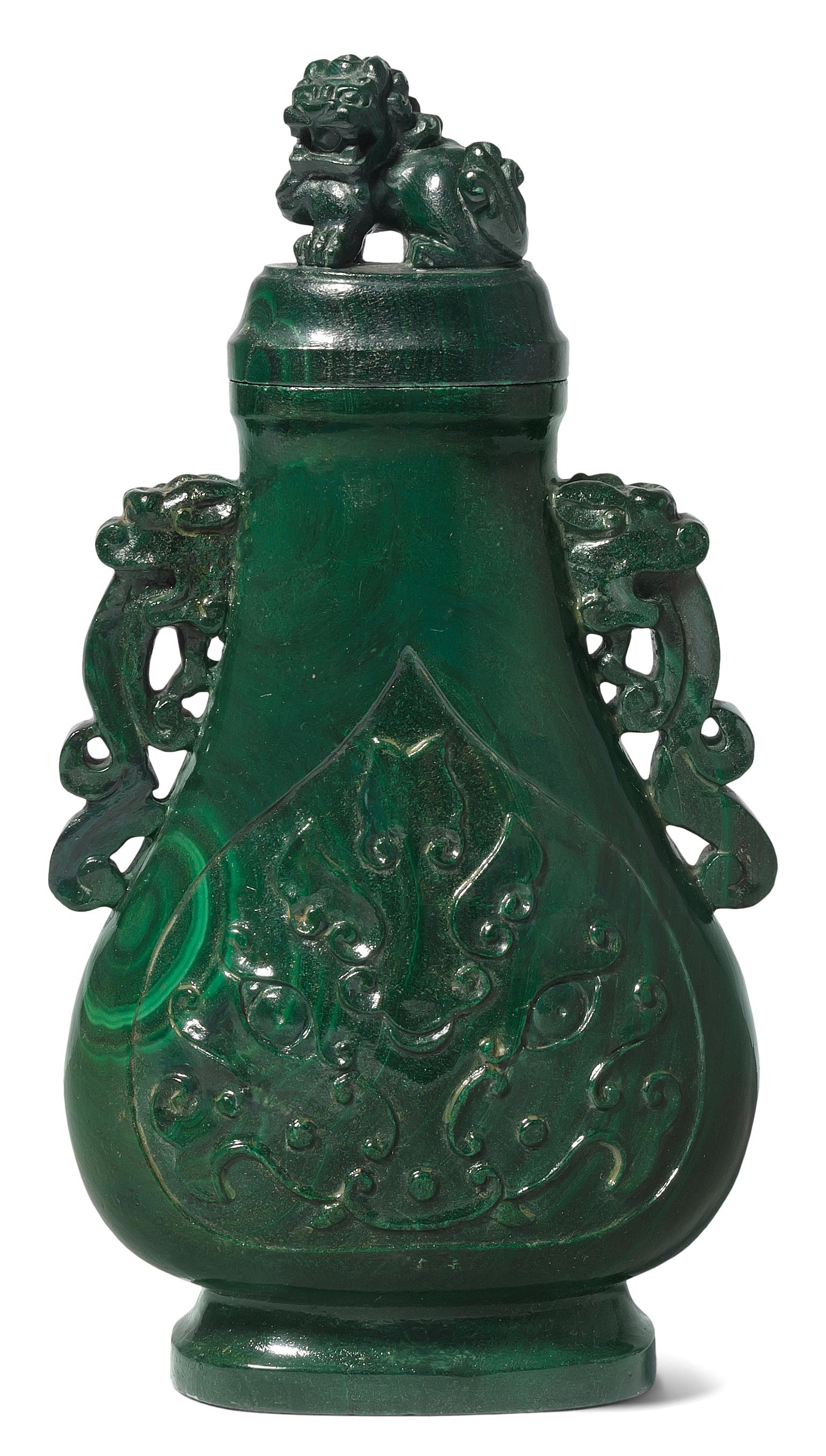 China, Mitte 20.Jh. Malachit. Flaches, birnenförmiges Gefäss reliefiert mit Tao-tie-Masken. Seitlich mit Drachenhenkeln. Vollplastischer Löwe als Knauf. H 18,5 cm.
