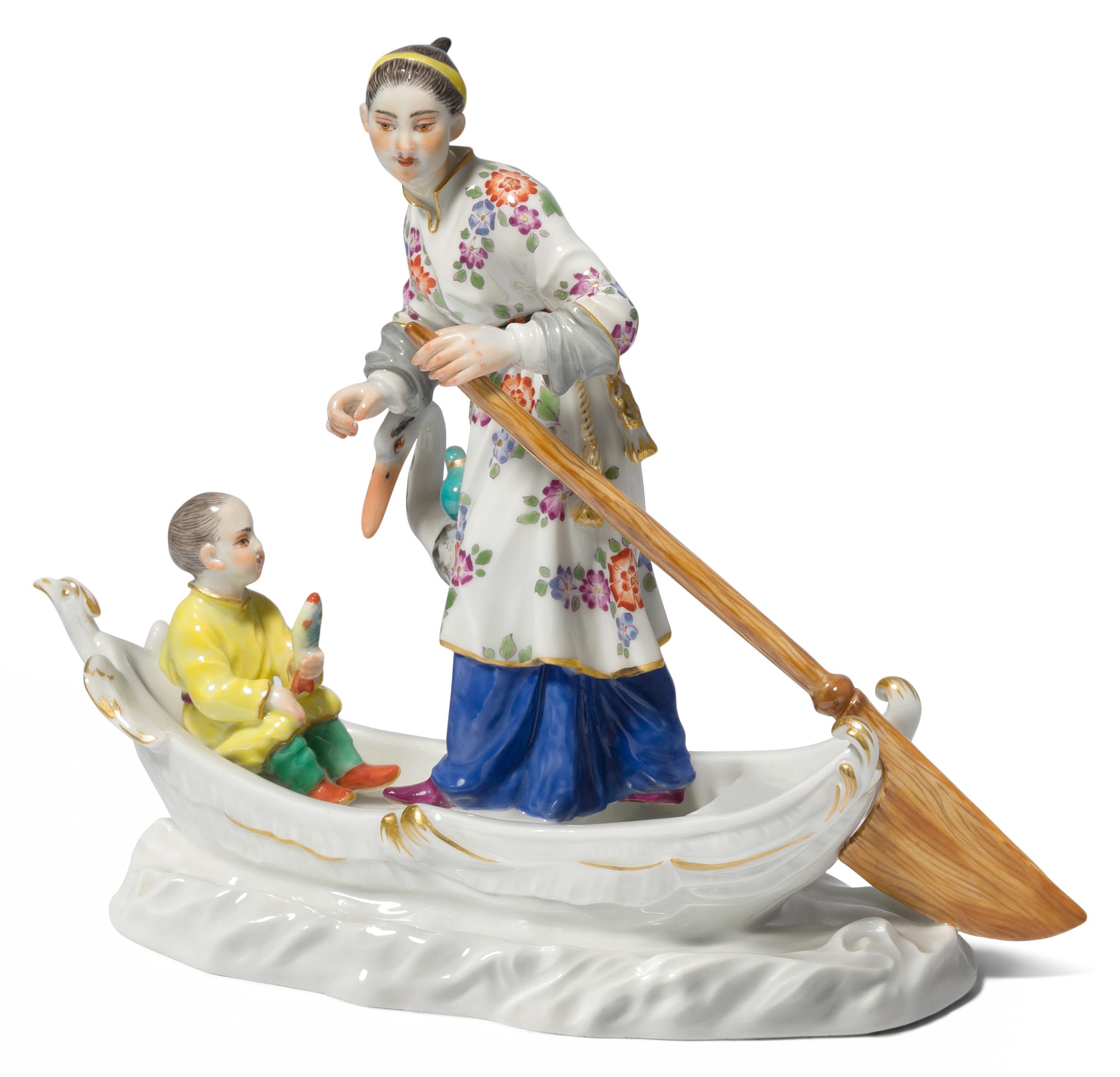 Nach 1980. Chinesin mit Kind in Boot. Modell von Johann Joachim Kaendler und Peter Reinicke um 1750. Porzellan, farbige Bemalung, Goldstaffierung. Bezeichnet: Schwertermarke (1. Wahl), Modellnummer 65526. H 15,5 cm.