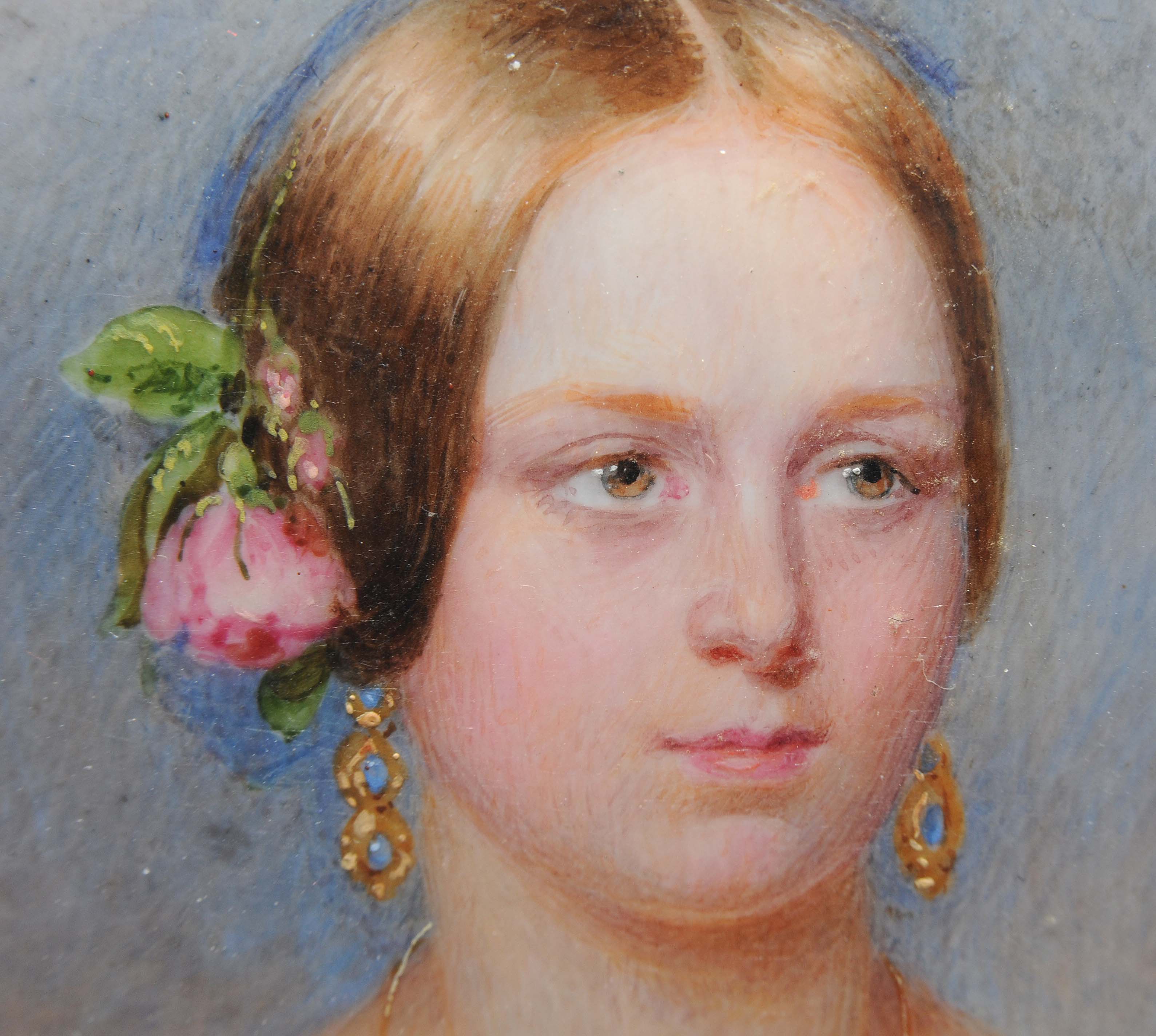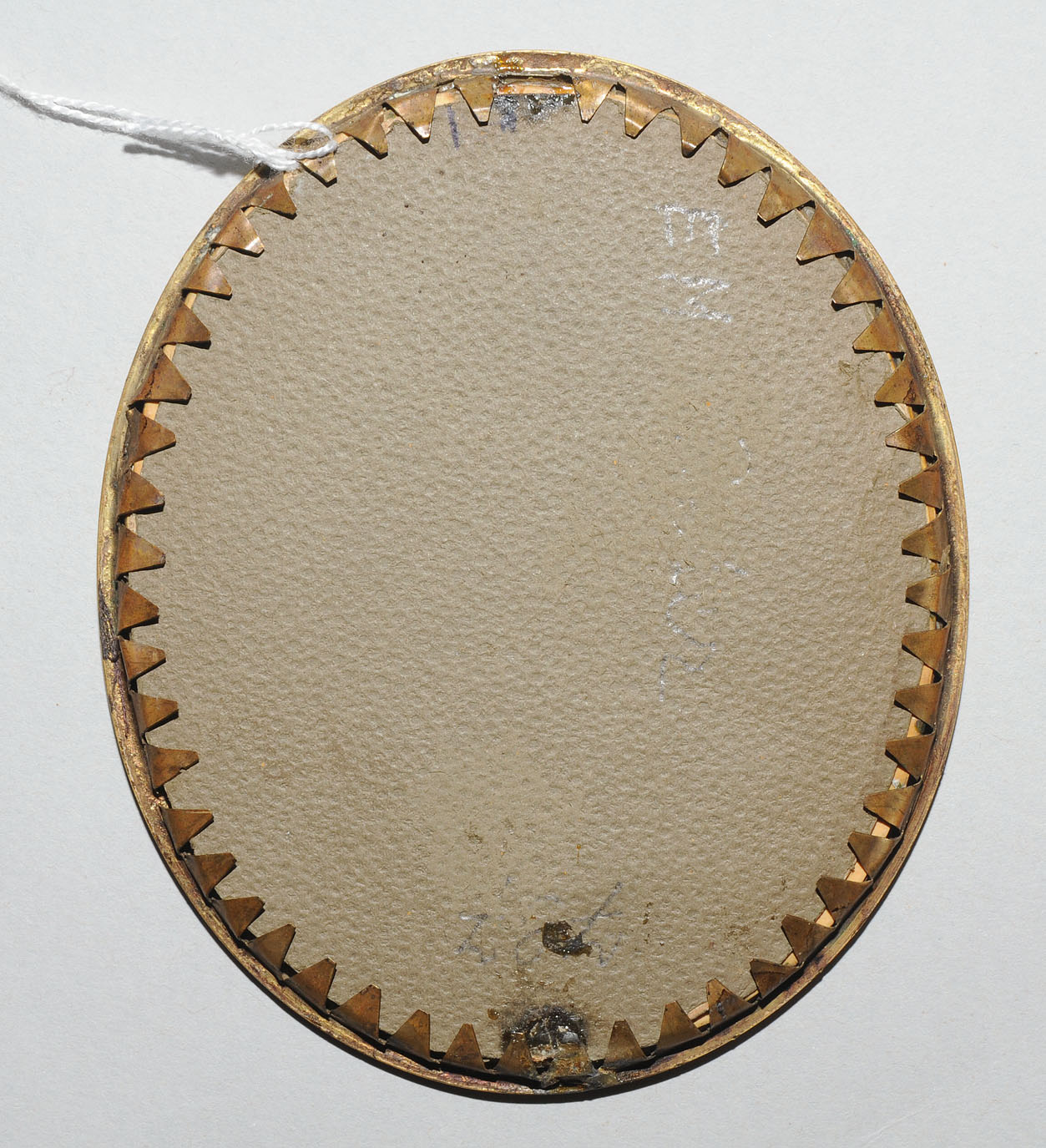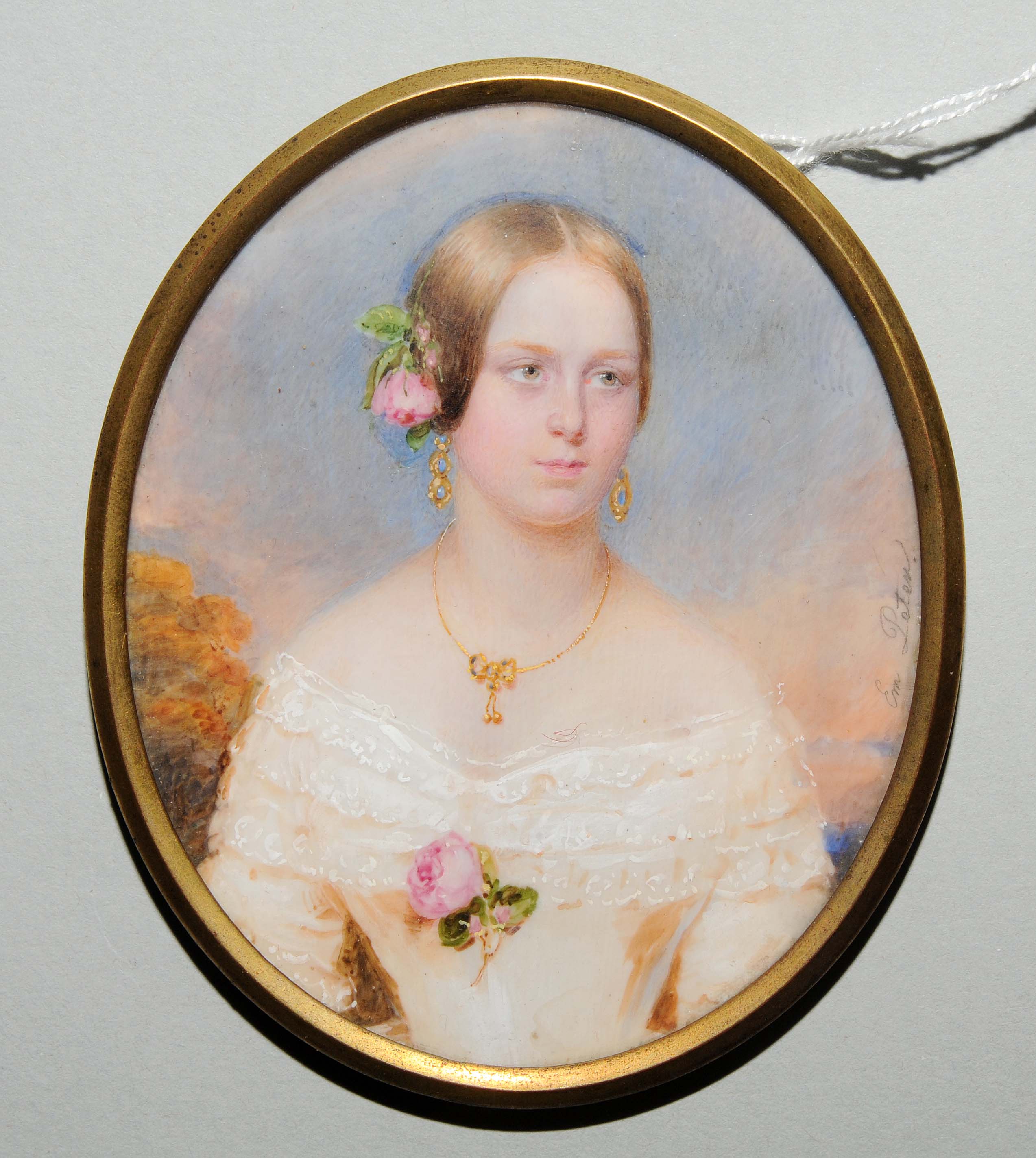 Österreich, 19.Jh. Gouche auf Elfenbein, oval. Junge Dame in weissem, schulterfreiem Kleid vor Himmelshintergrund. Rechts signiert Em Peter (Emanuel Thomas Peter, Jägerndorf 1799–1873 Wien). Gefasst. 9,7x7,8 cm.