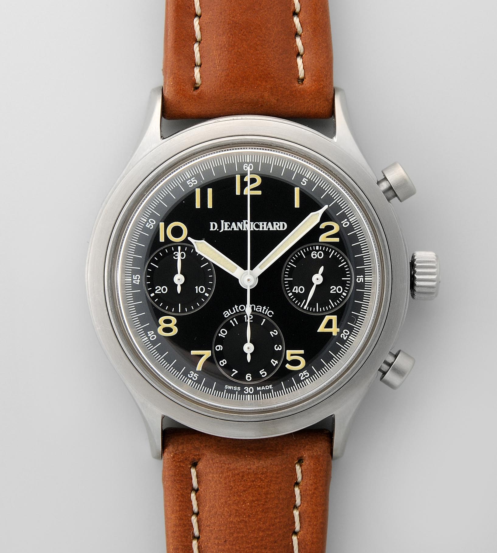 Runder, automatischer Herrenchronograph in Stahlgehäuse. Boden verschraubt mit Jean Richardgravur, Kaliber 2824-2, Referenznummer 356/25004, D 38 mm. Anthrazitfarbenes Zifferblatt mit gelben, arabischen Stundenleuchtzahlen, weissen Minuten-, Sekundenindizes mit arabischer 60er Einteilung. Weiss umrandete Lancetten-Leuchtzeiger, zentraler Chronographenzeiger, kleine Sekundenanzeige bei 3 Uhr, kleine 30 Minutenanzeige bei 9 Uhr, kleine 12 Stundenanzeige bei 6 Uhr. Drücker für den Chronographen bei 2 und 4 Uhr, Krone bei 3 Uhr. Hellbraunes Original Lederarmband mit Dornschliesse. Neuwertig, kaum Gebrauchsspuren.