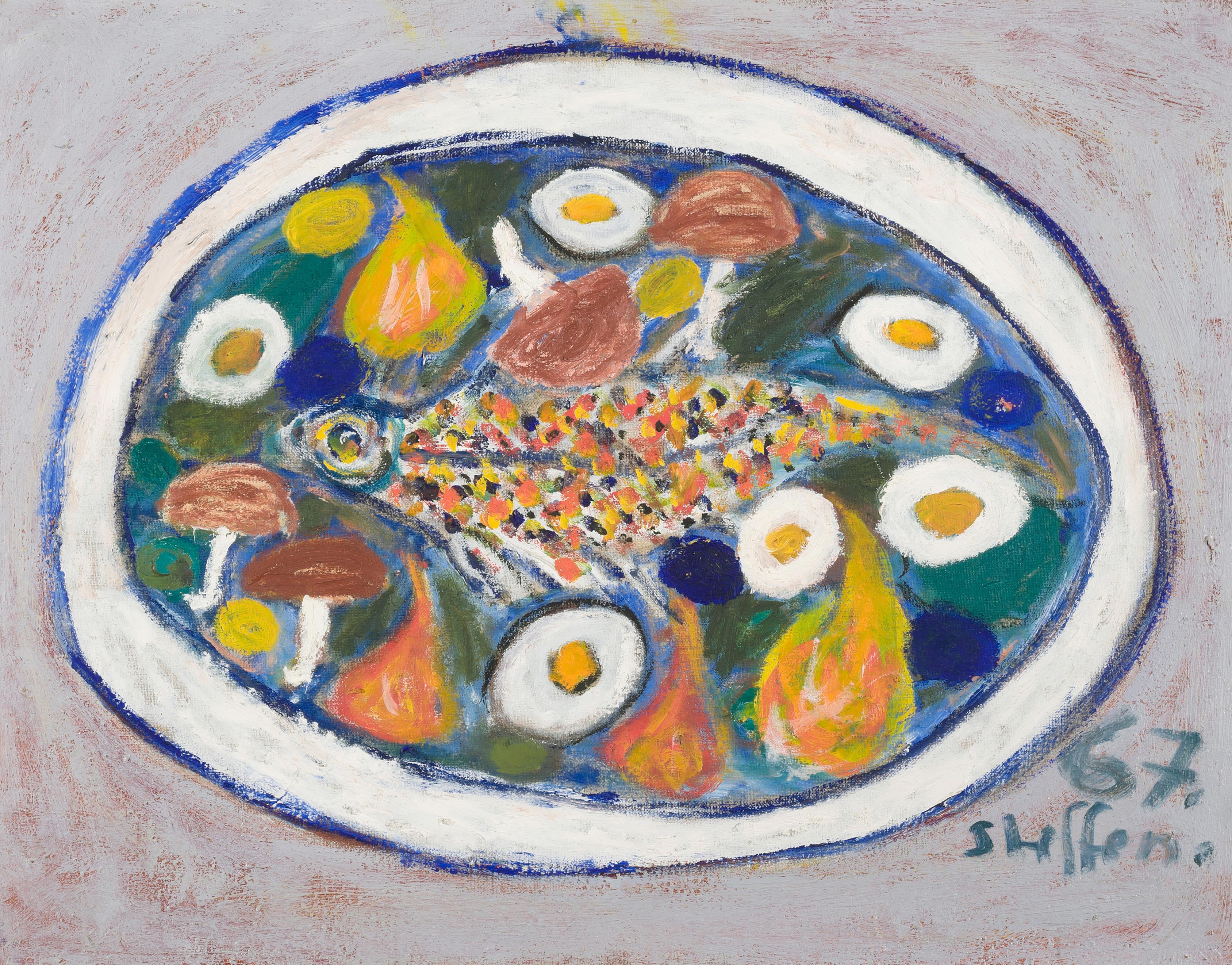Fischplatte, 1967. Öl auf Leinwand. Unten rechts signiert und datiert. 45,5x60 cm.