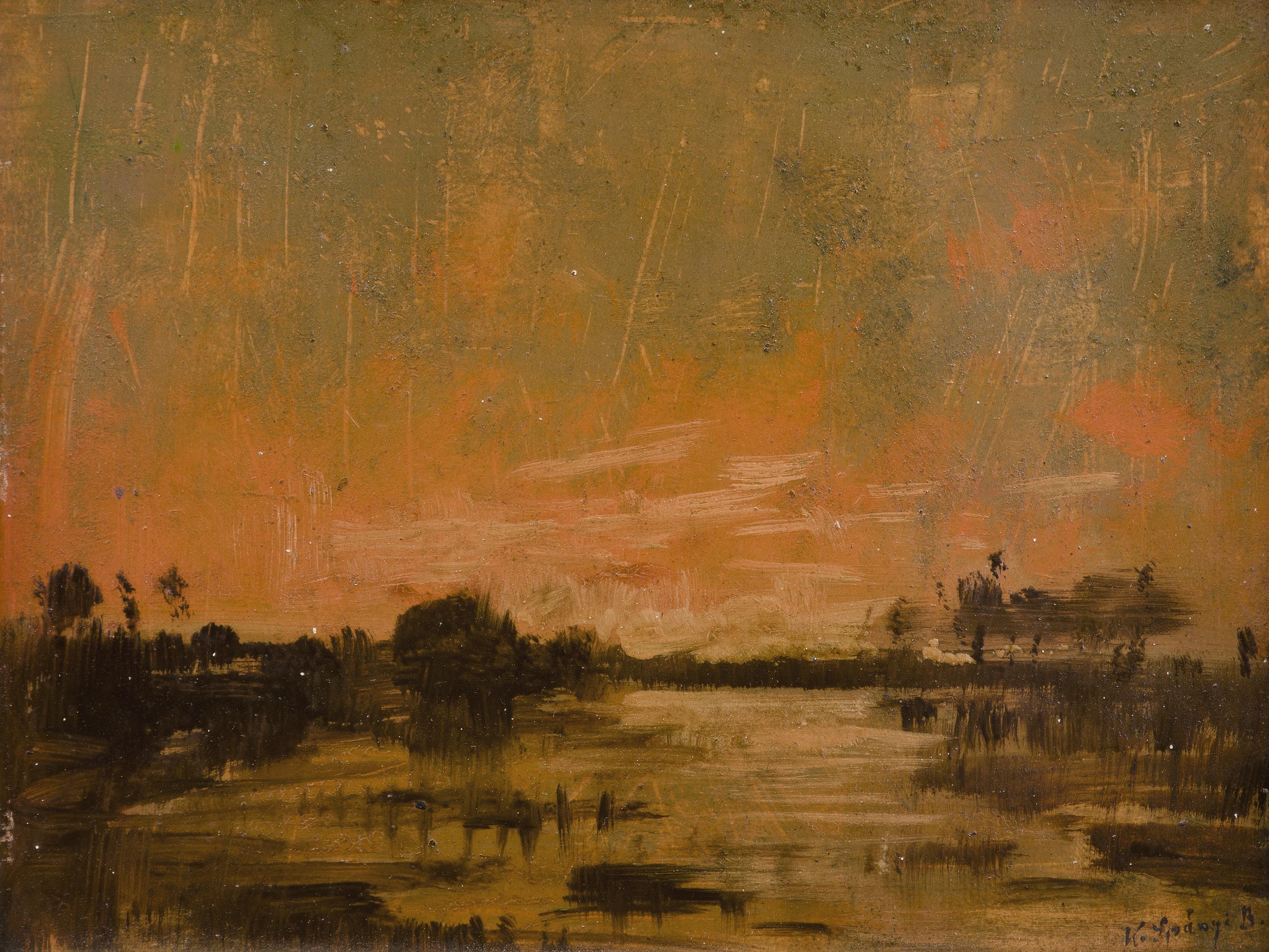 Uferlandschaft im Abendrot. Öl auf Karton, aufgezogen auf Karton (dieser auf der Rückseite mit einem Stück bemalter Leinwand versehen. Unten rechts signiert. 19,4x25,6 cm.