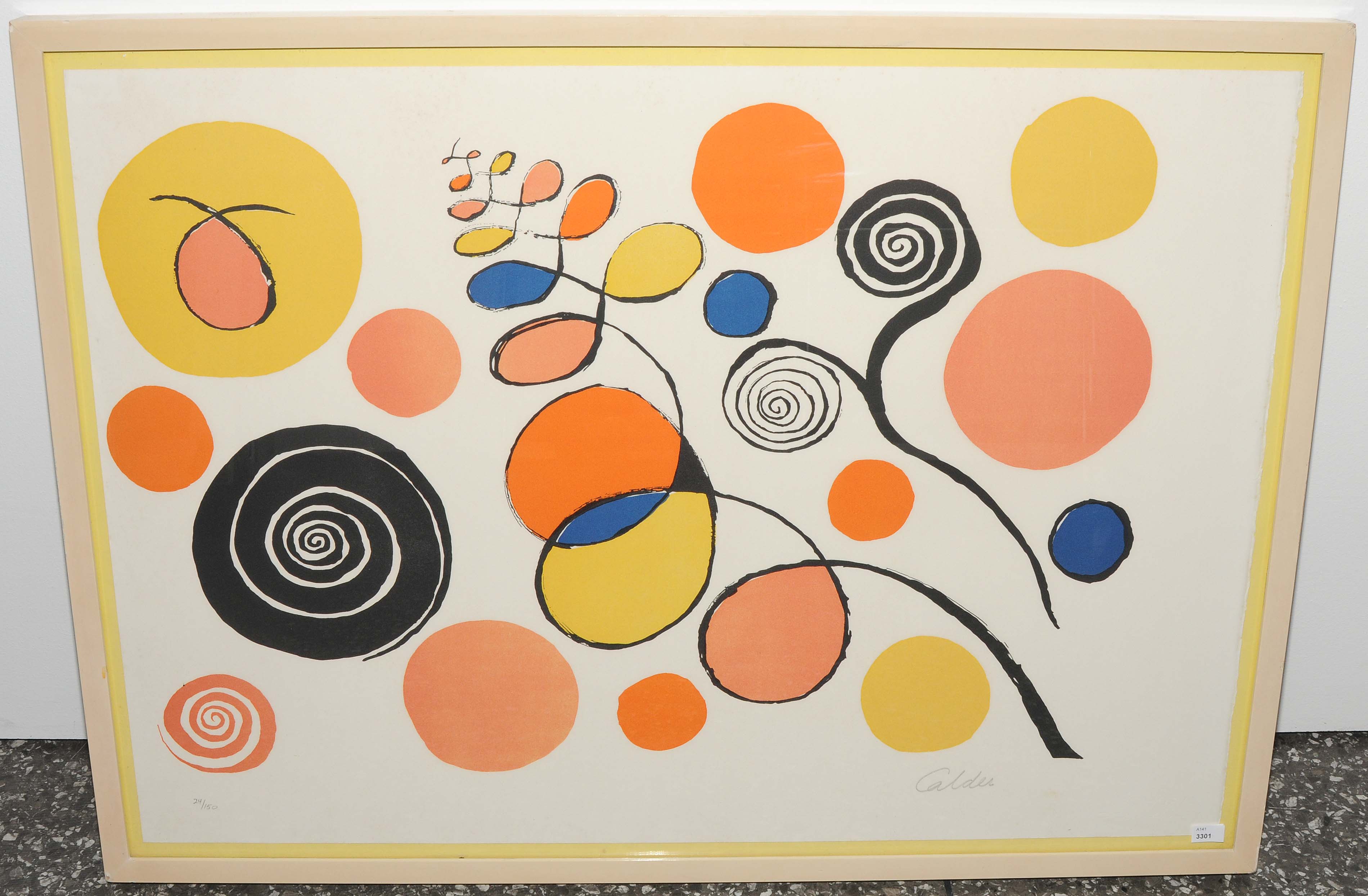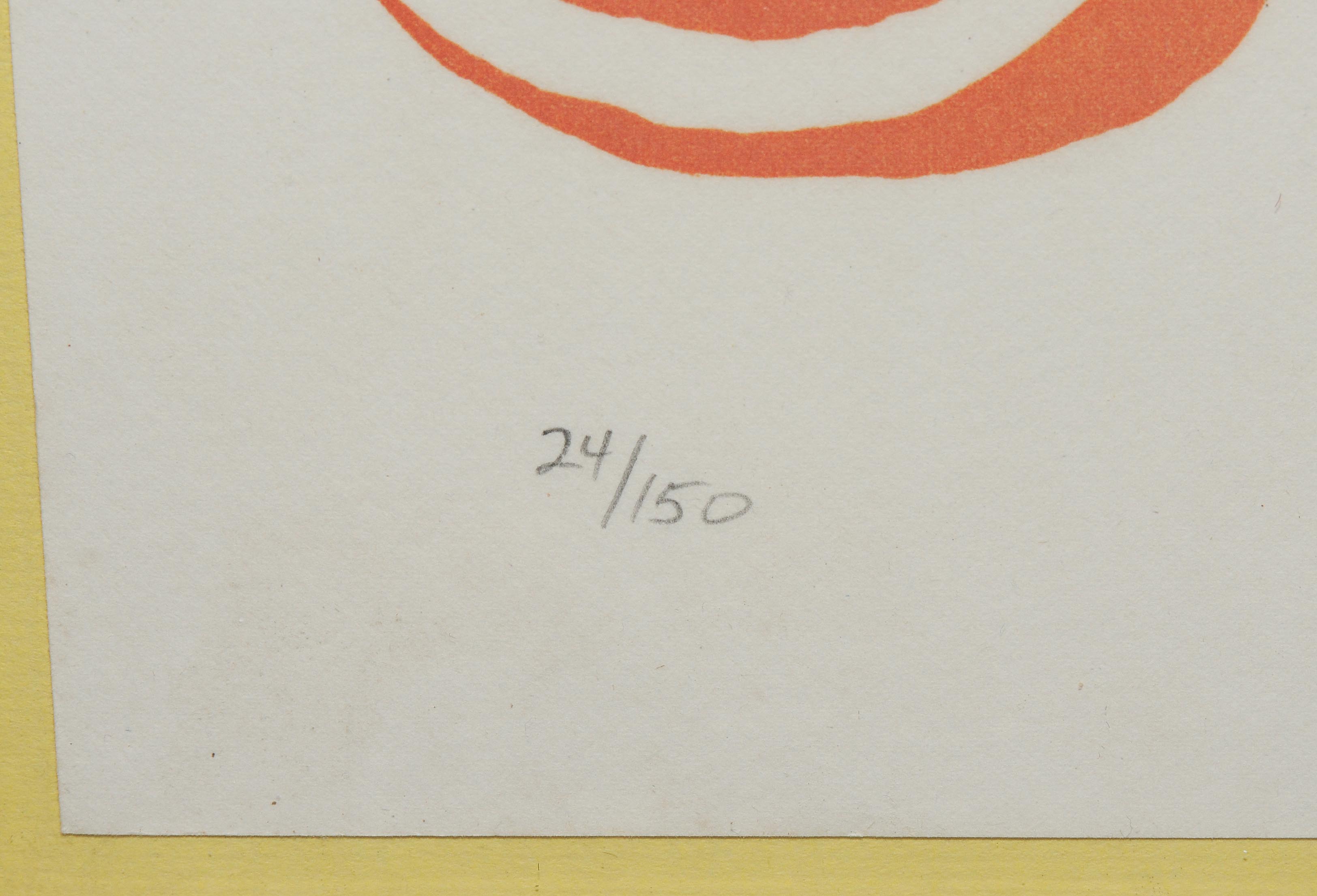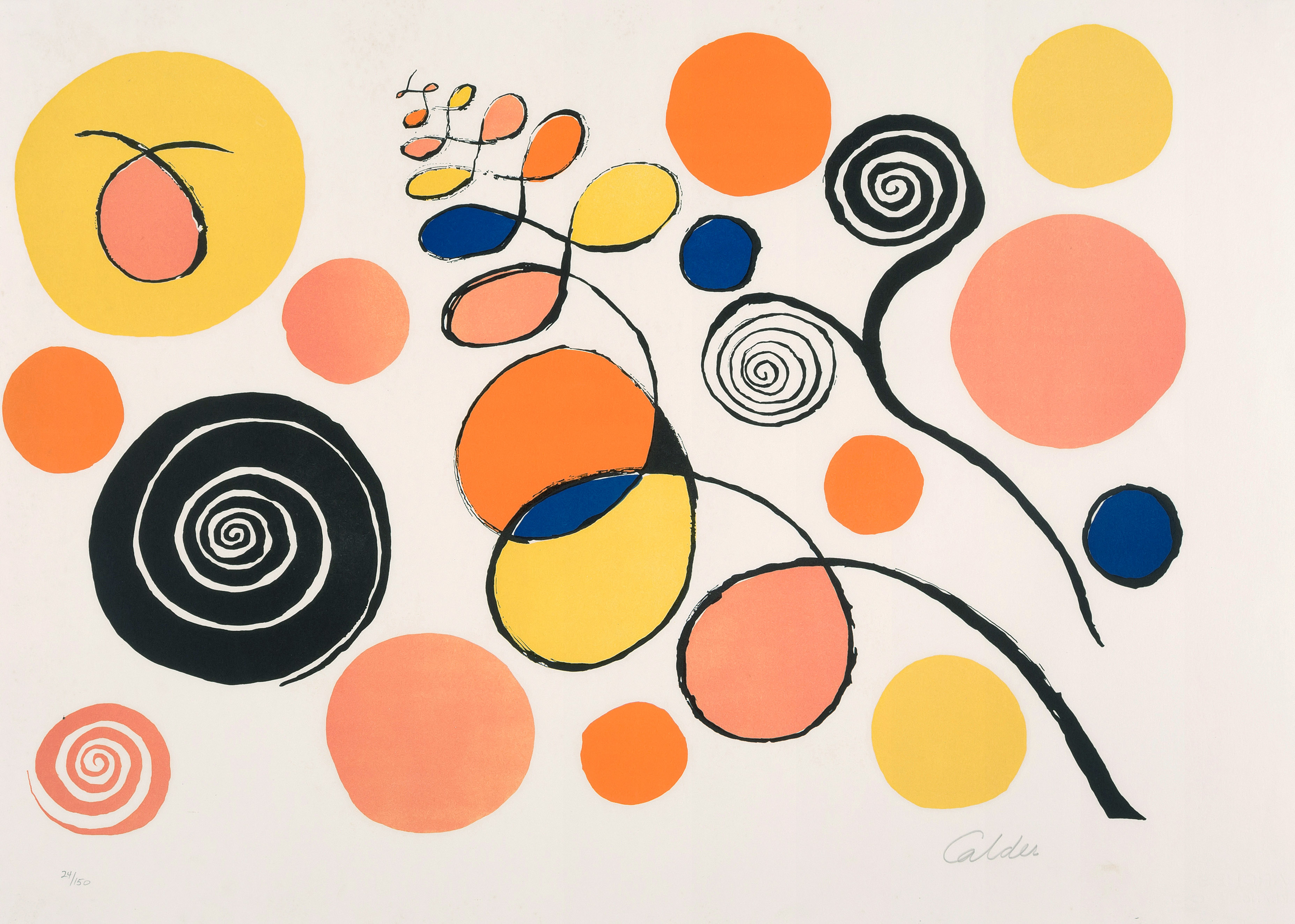 Spiralen und Kreise. Farblithographie auf Arches. 24/150. Unten rechts in Bleistift signiert. Blattgrösse 60x85 cm. Gerahmt. -Blatt minimst gebräunt und fleckig. Ränder und Ecken leicht bestossen. Verso am oberen Rand partiell an Rückkarton montiert.