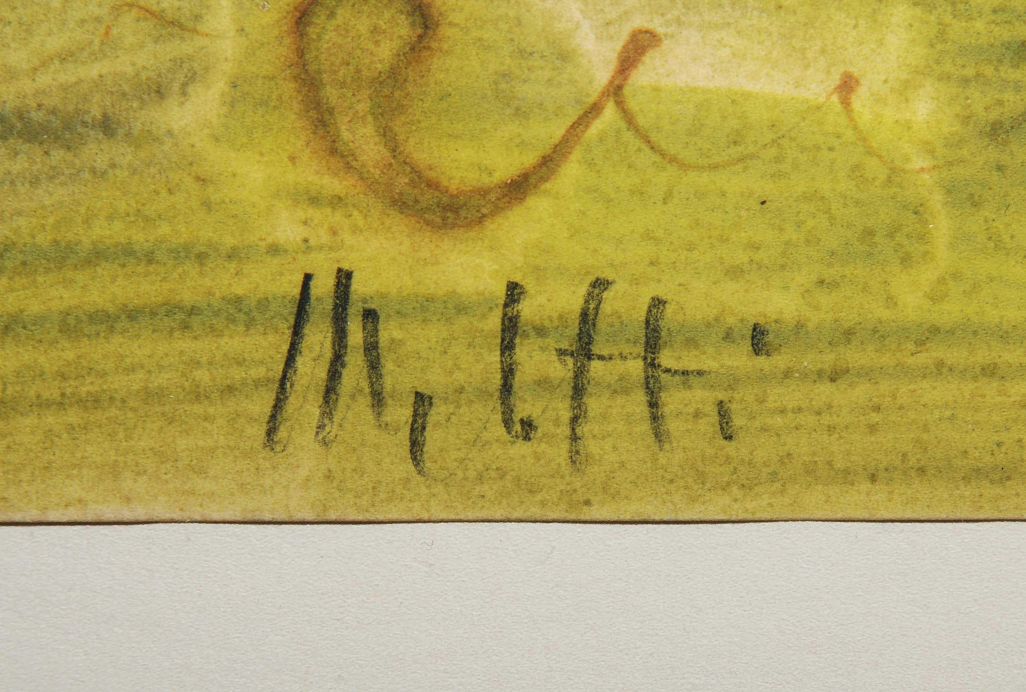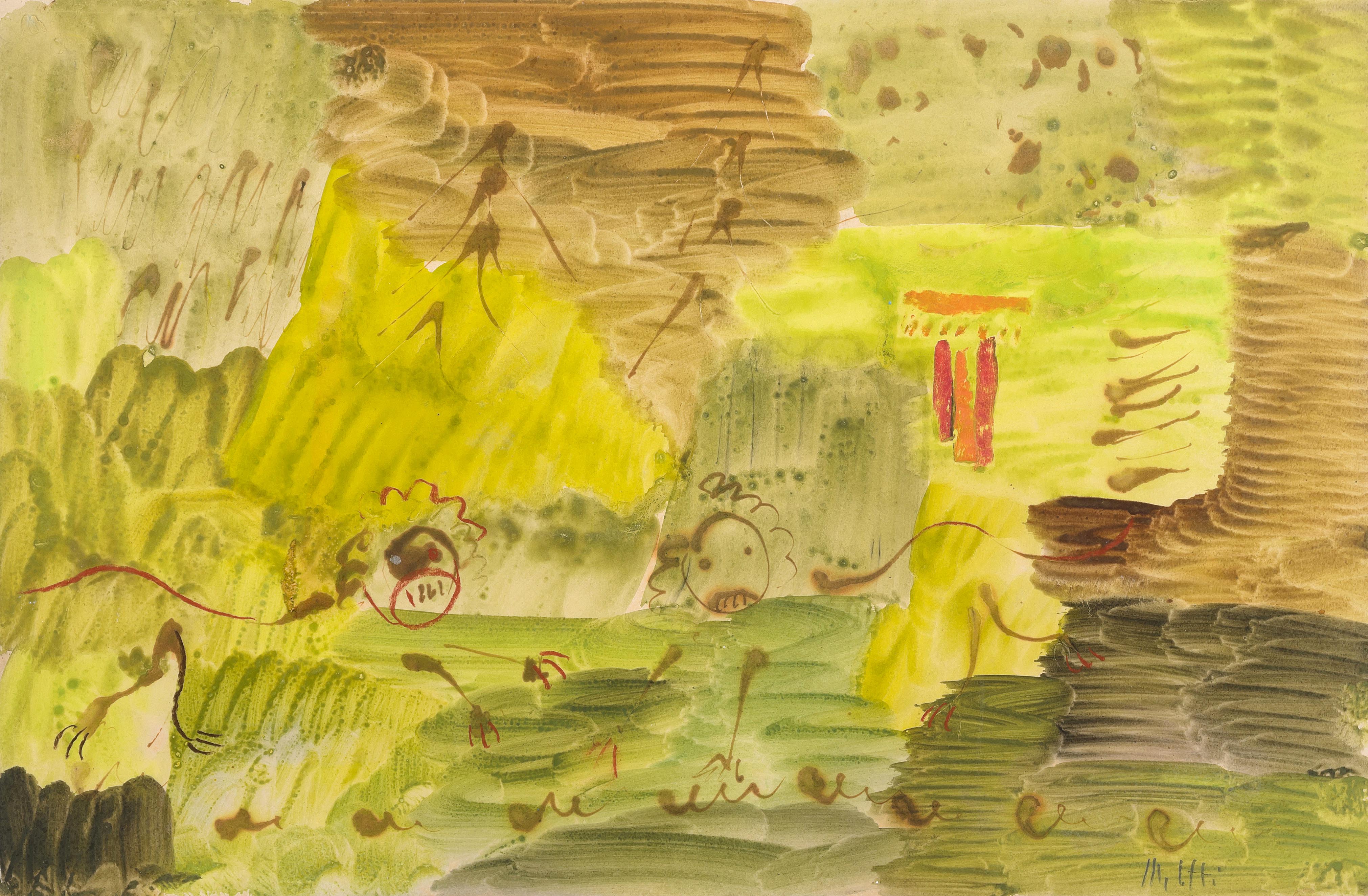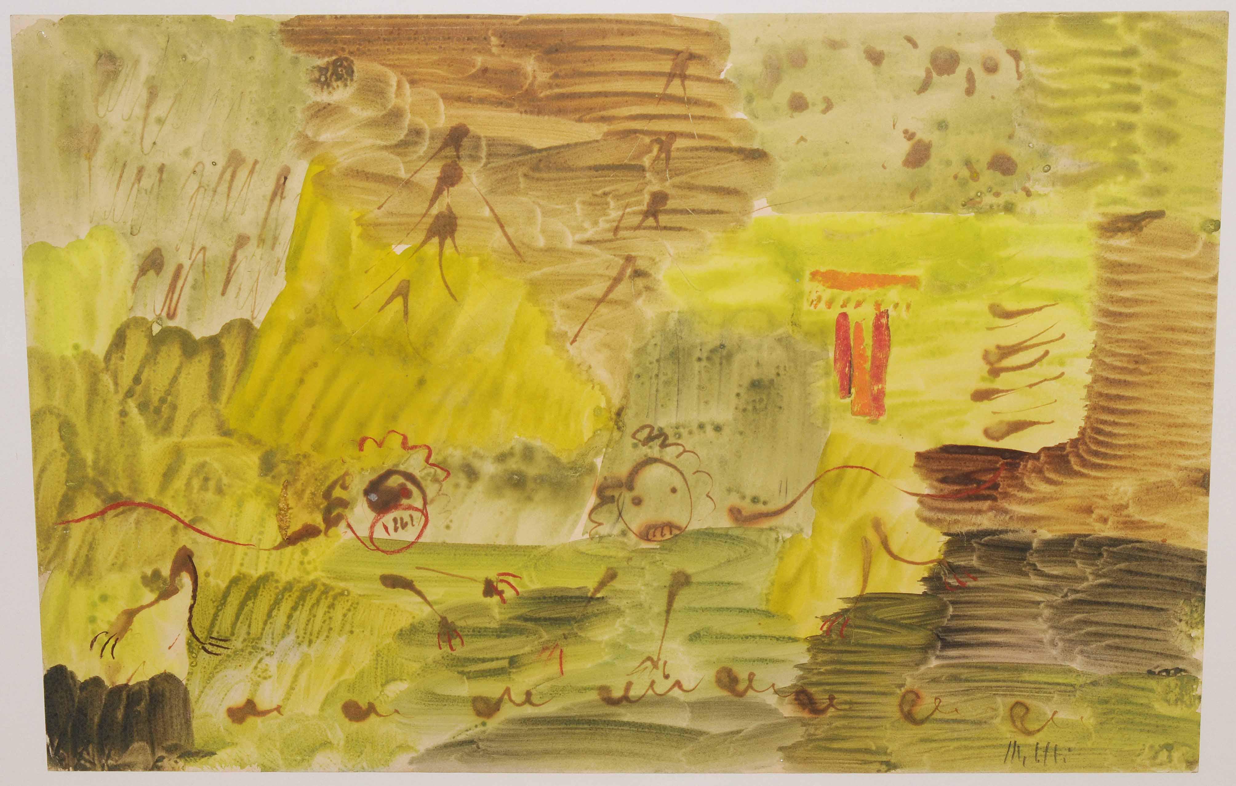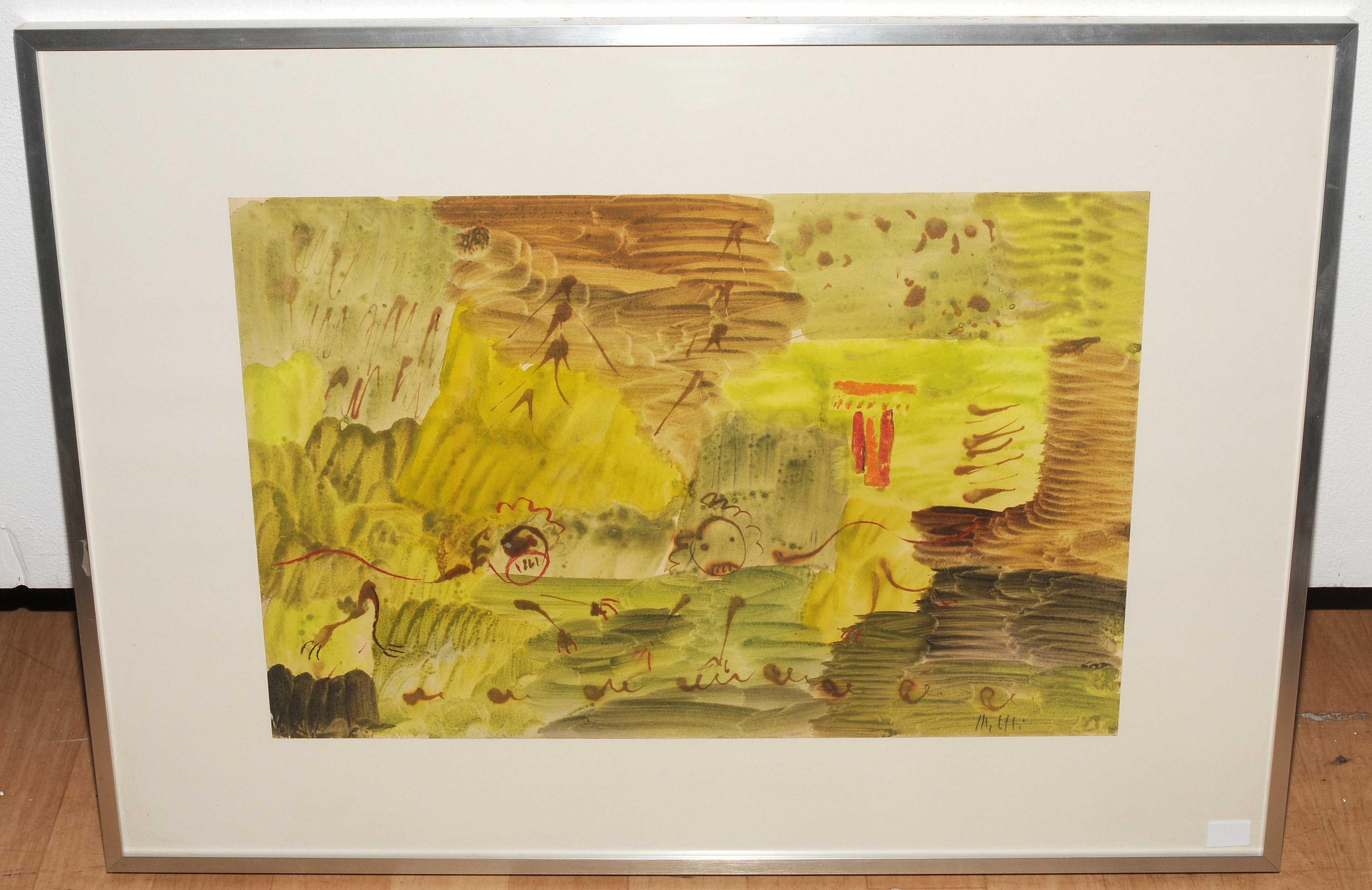 Ohne Titel. Landschaft mit Tieren. Mischtechnik auf Papier. Unten rechts in Bleistift signiert. Blattgrösse 32,5x49,6 cm. Gerahmt. -Blatt leicht gewellt mit wenigen Knittern. Verso in den oberen Ecken an Rückblatt montiert.