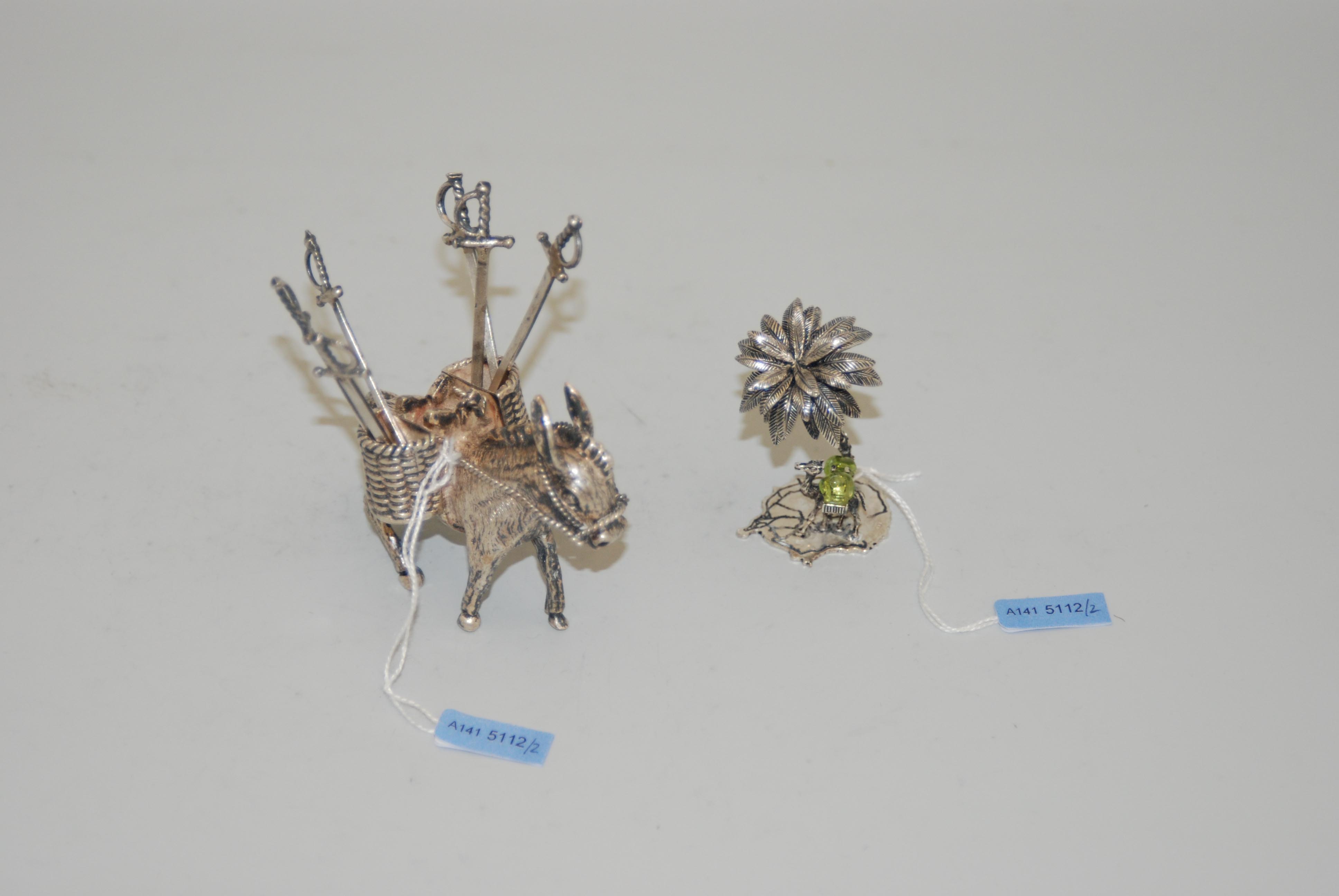 Nach 1900. Silber. Palme mit Kamel, Esel als Zahnstocherbehältnis. Beigegeben: 6 Apérosticks. H 6 cm/ca. 95g.