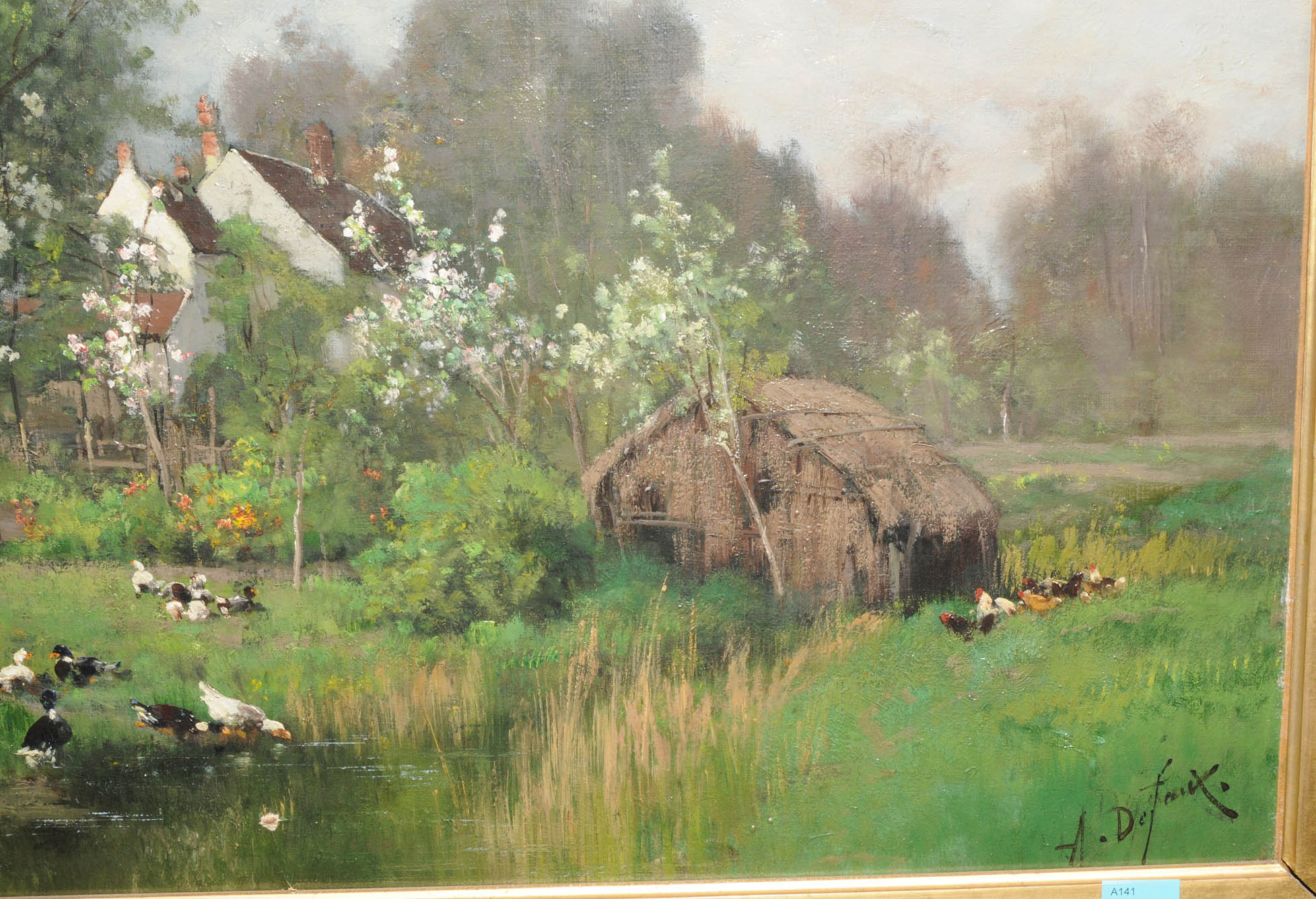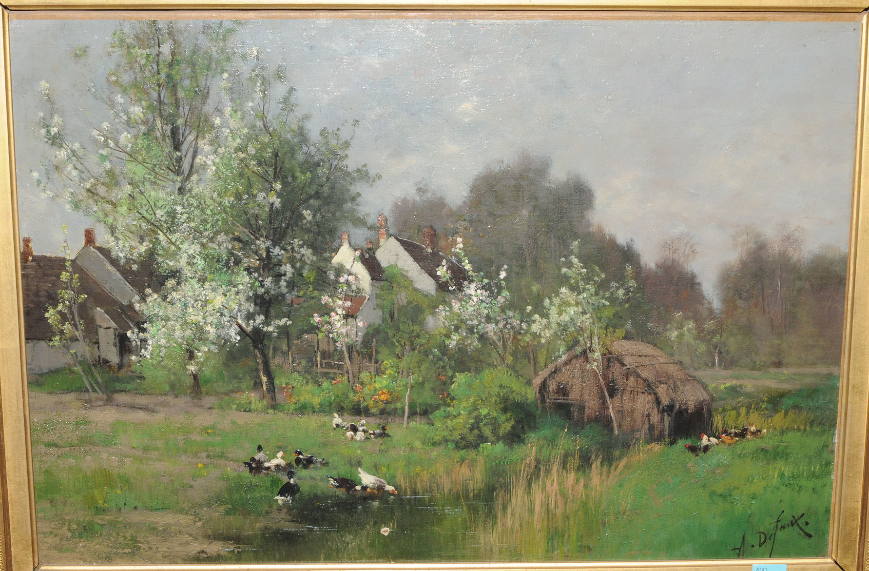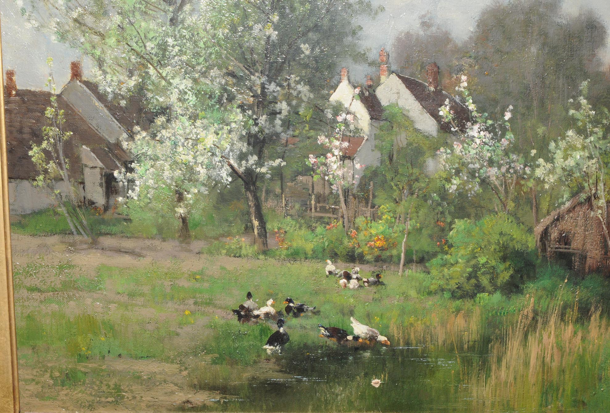 Enten am Teich, im Hintergrund Bauernhäuser. Öl auf Leinwand. Unten rechts signiert. 40,5x58,5 cm.