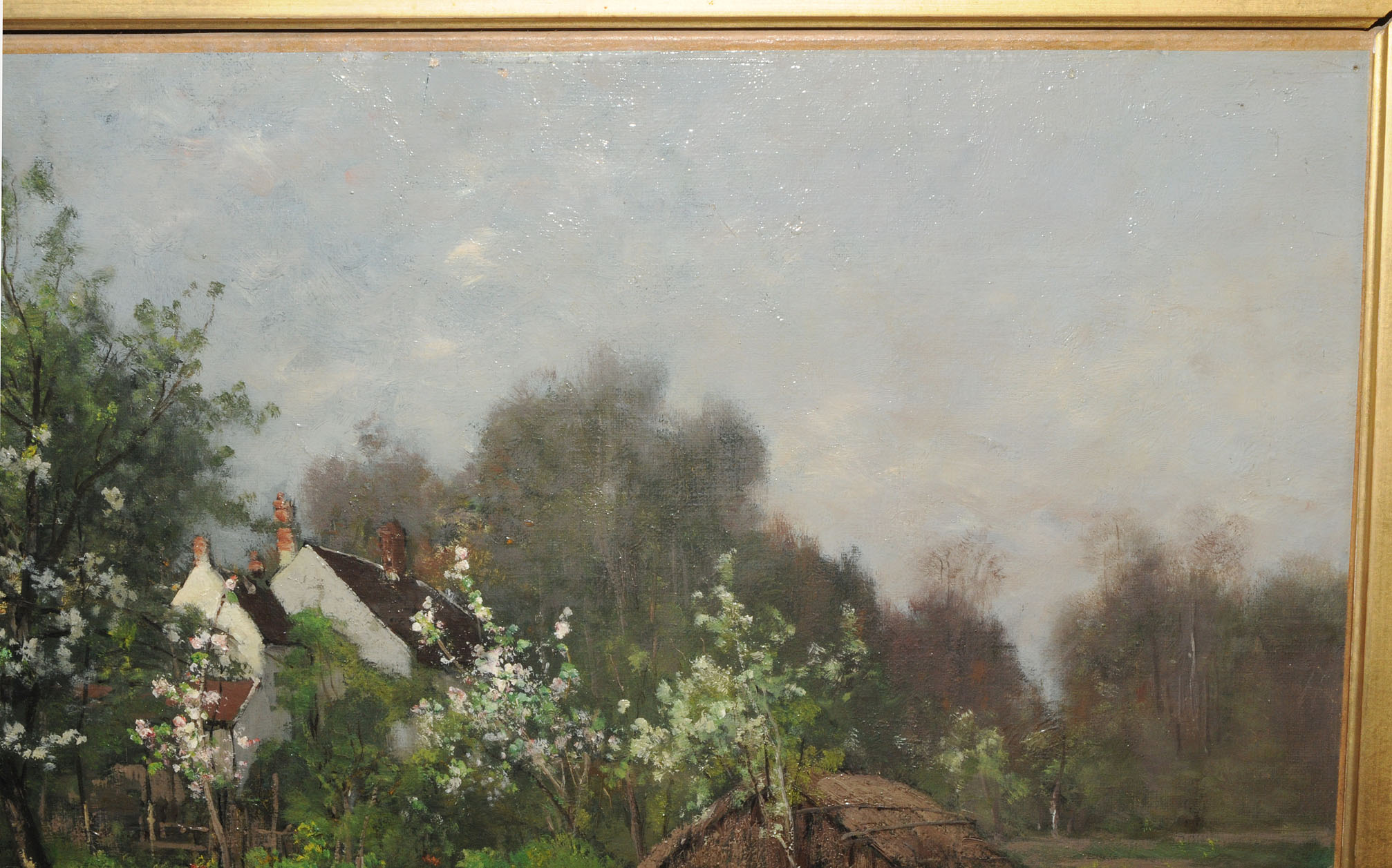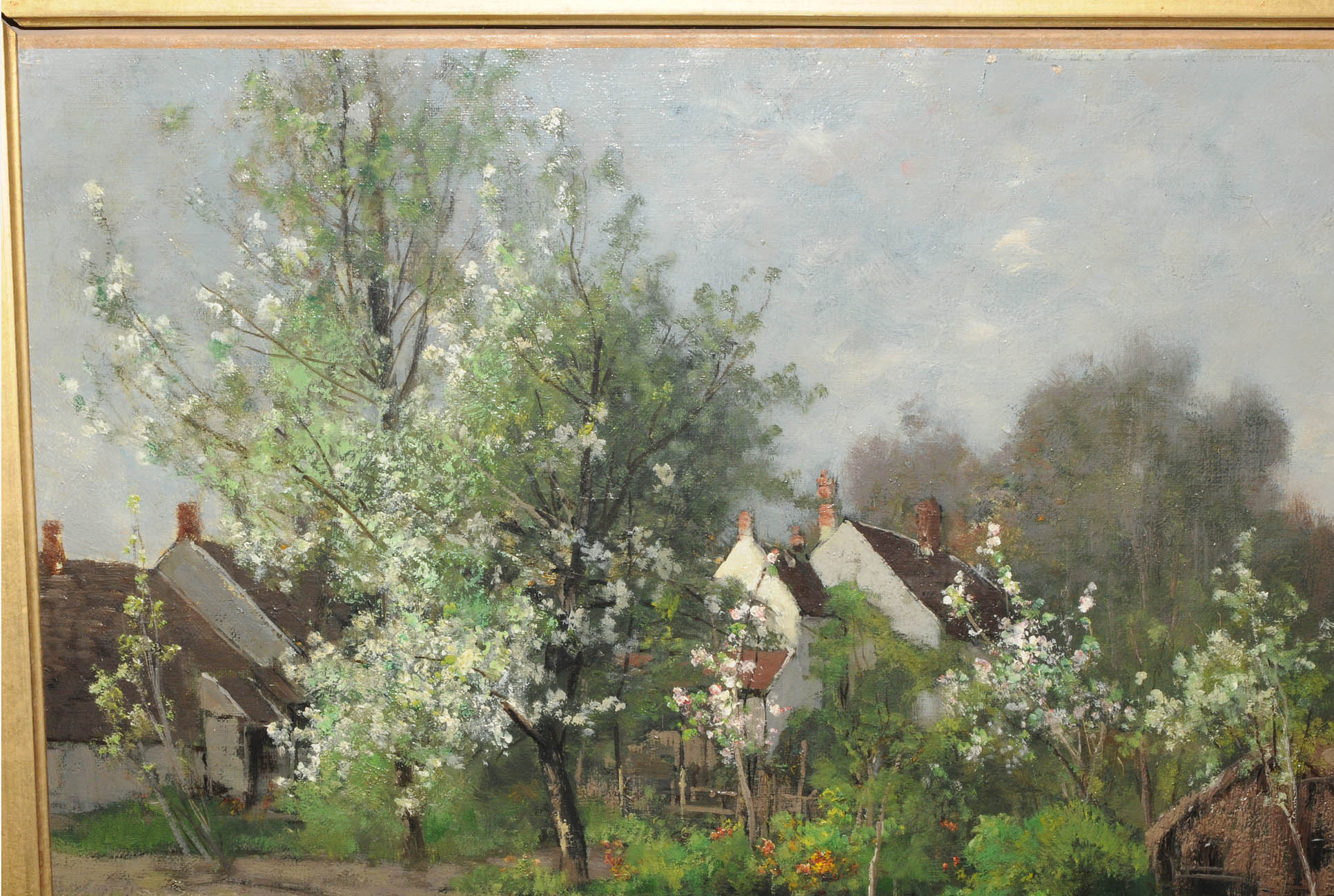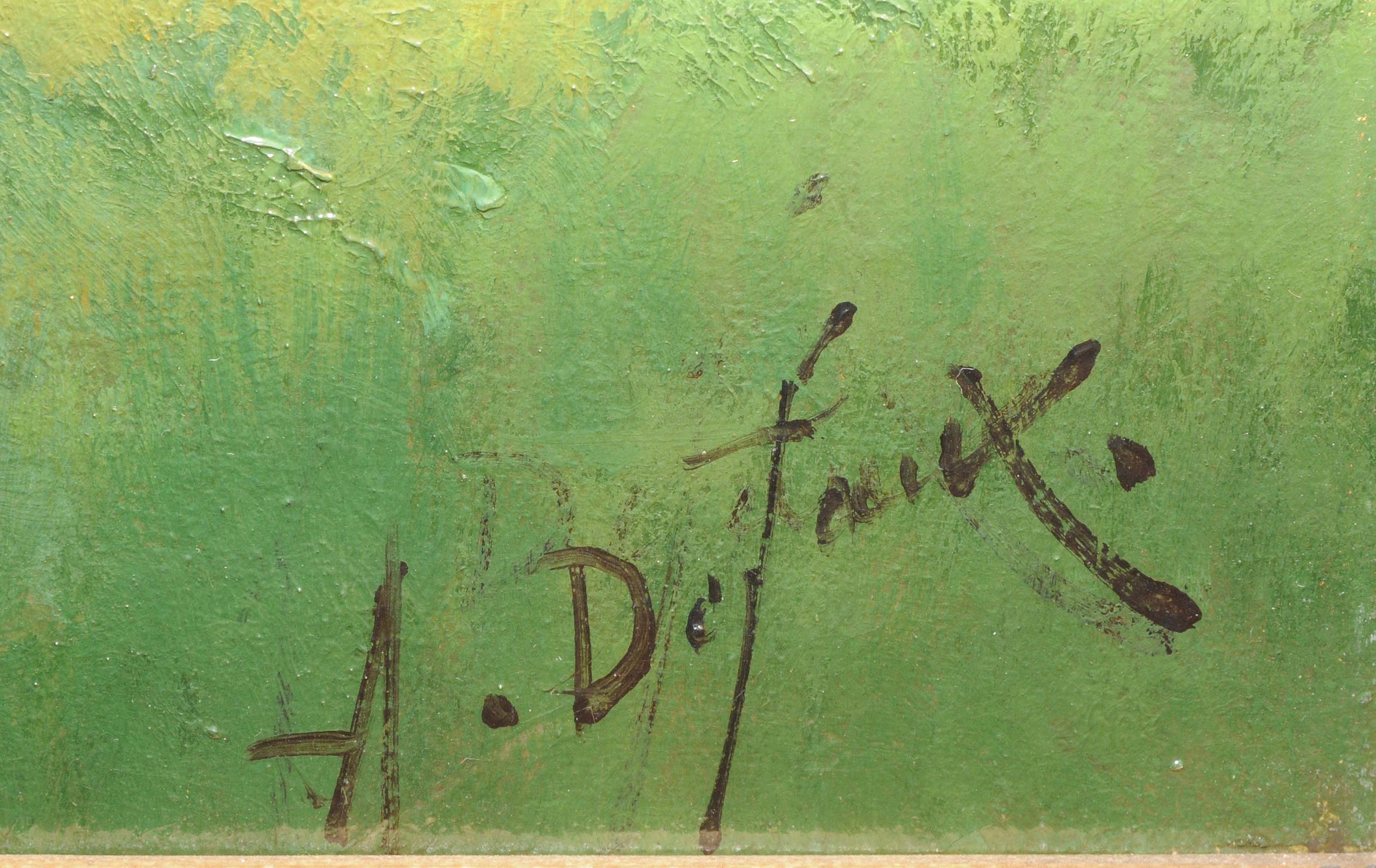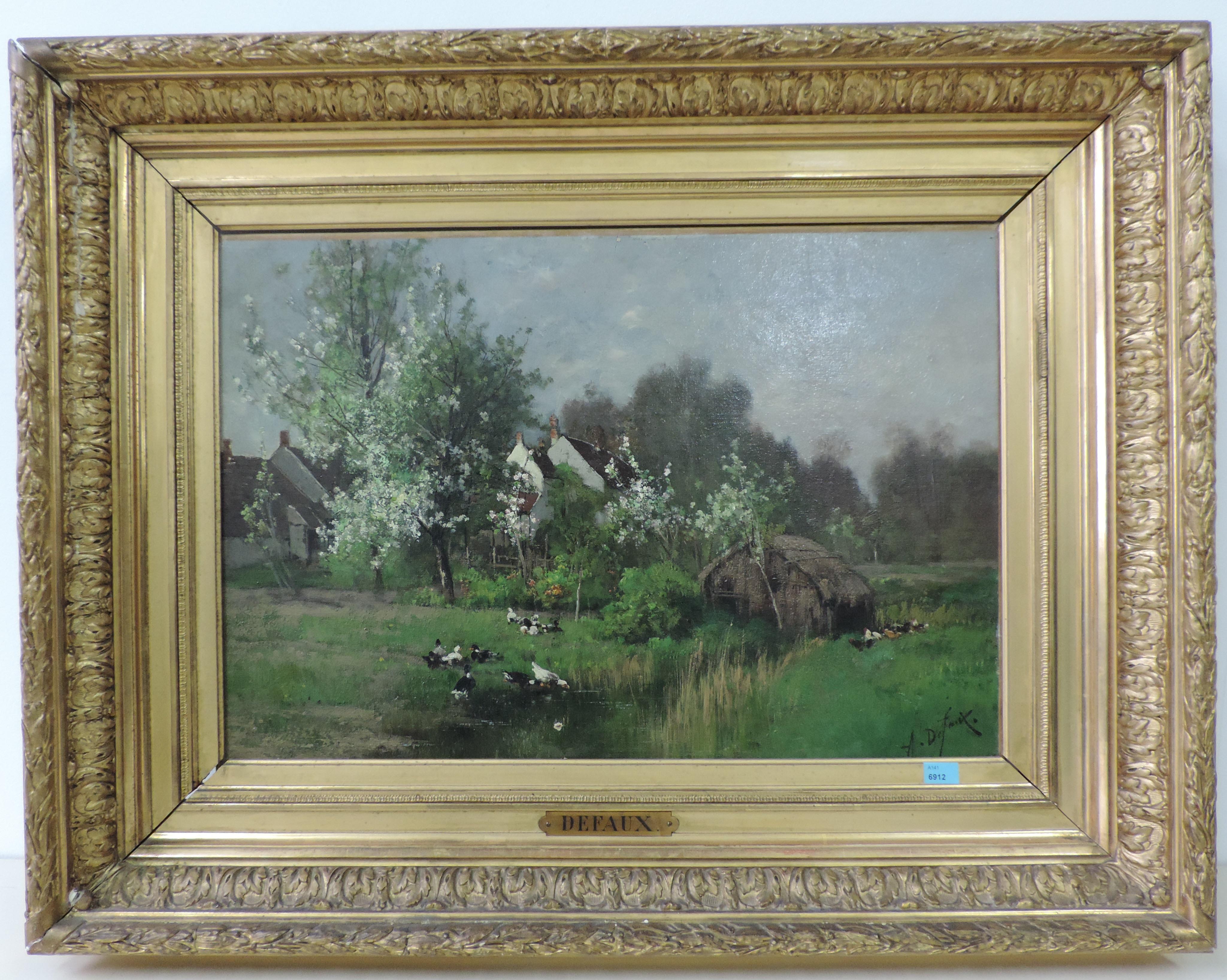 Enten am Teich, im Hintergrund Bauernhäuser. Öl auf Leinwand. Unten rechts signiert. 40,5x58,5 cm.