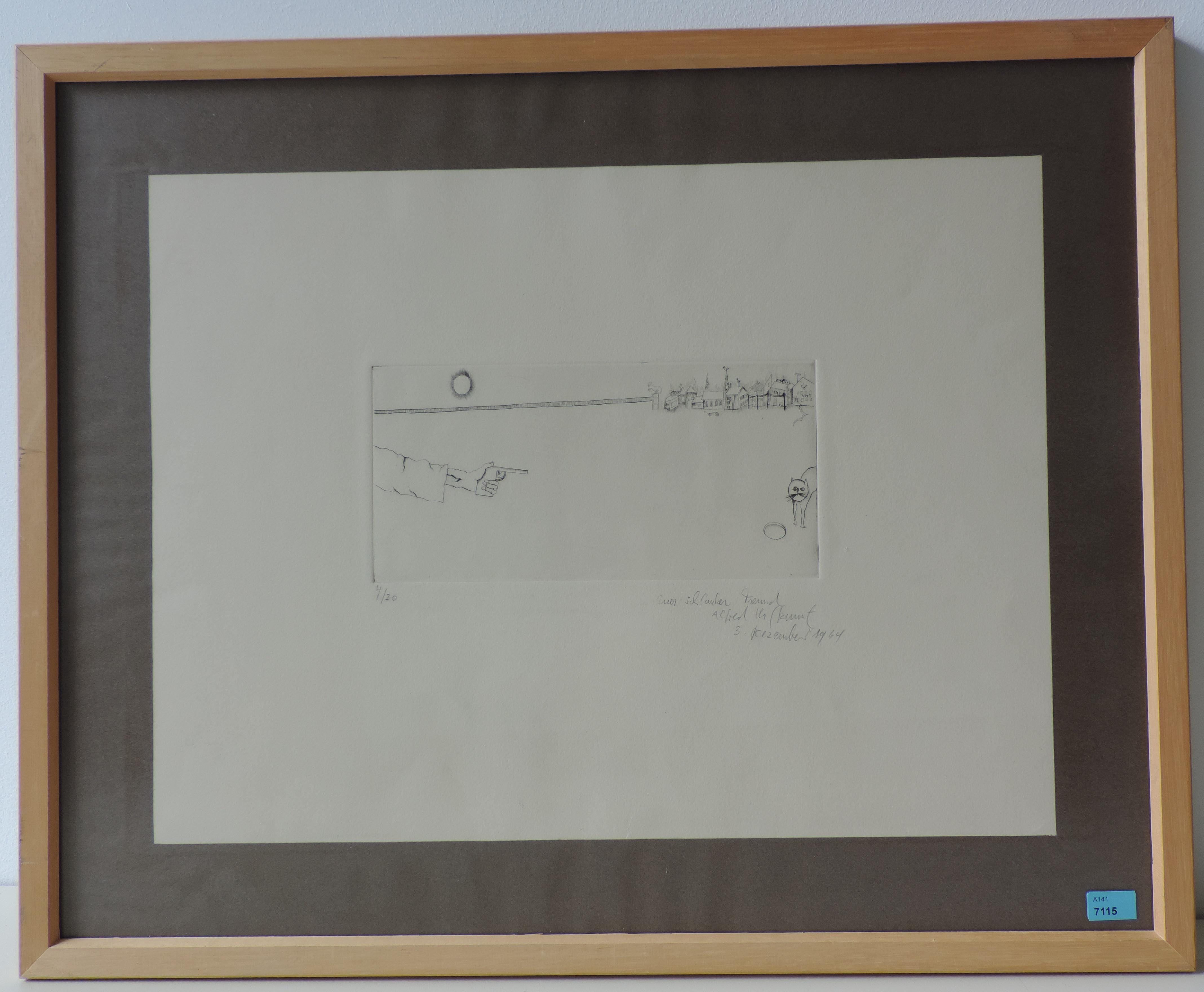 "Euer schlanker Freund". 1964. Radierung. 4/20. Unten rechts betitelt, signiert und datiert: "3. Dezember 1964". Blattgrösse 36,5x48,5 cm. Gerahmt.