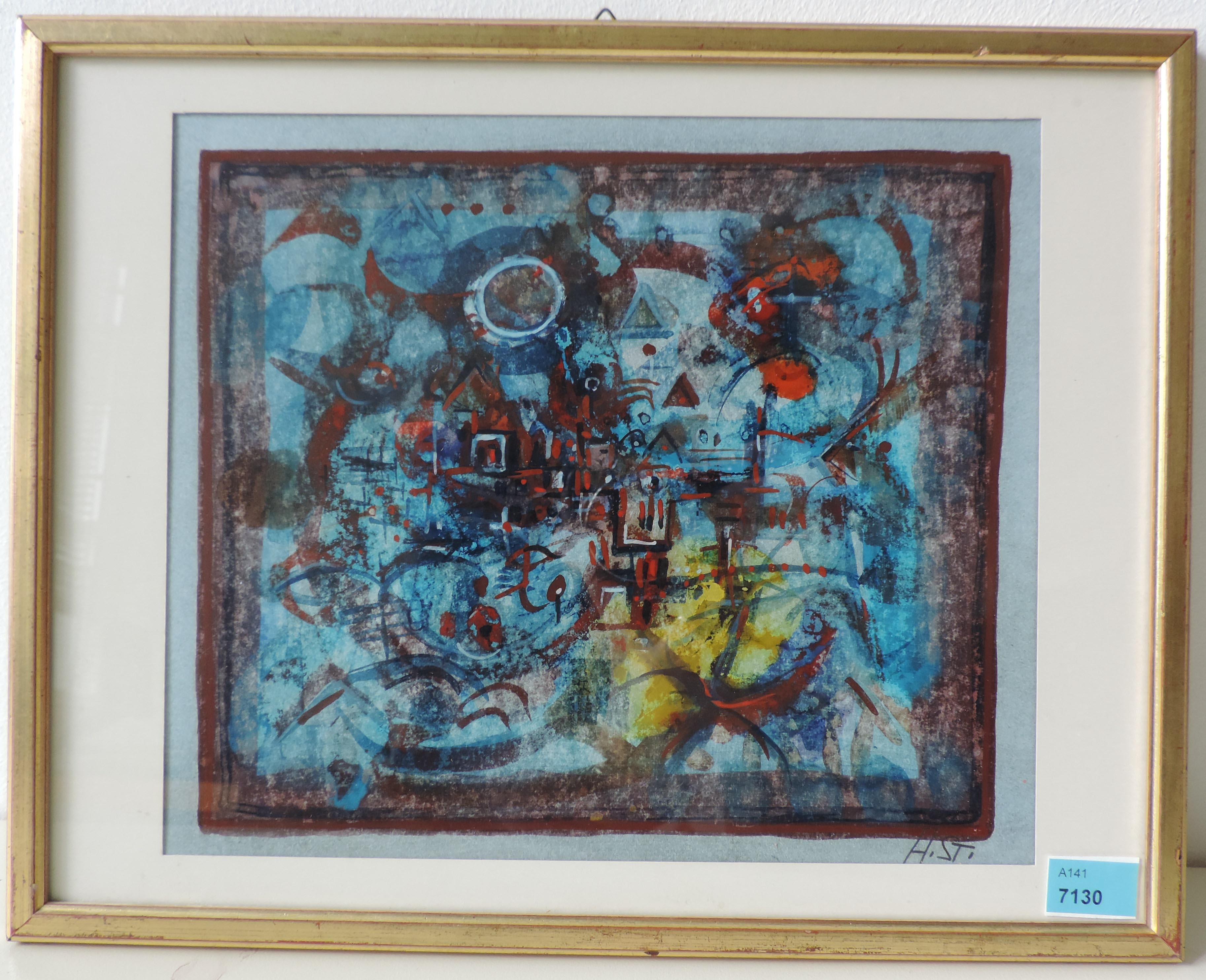 Landschaft. Mischtechnik auf Papier. Unten rechts monogrammiert. Lichtmass 20,5x24 cm. Gerahmt.