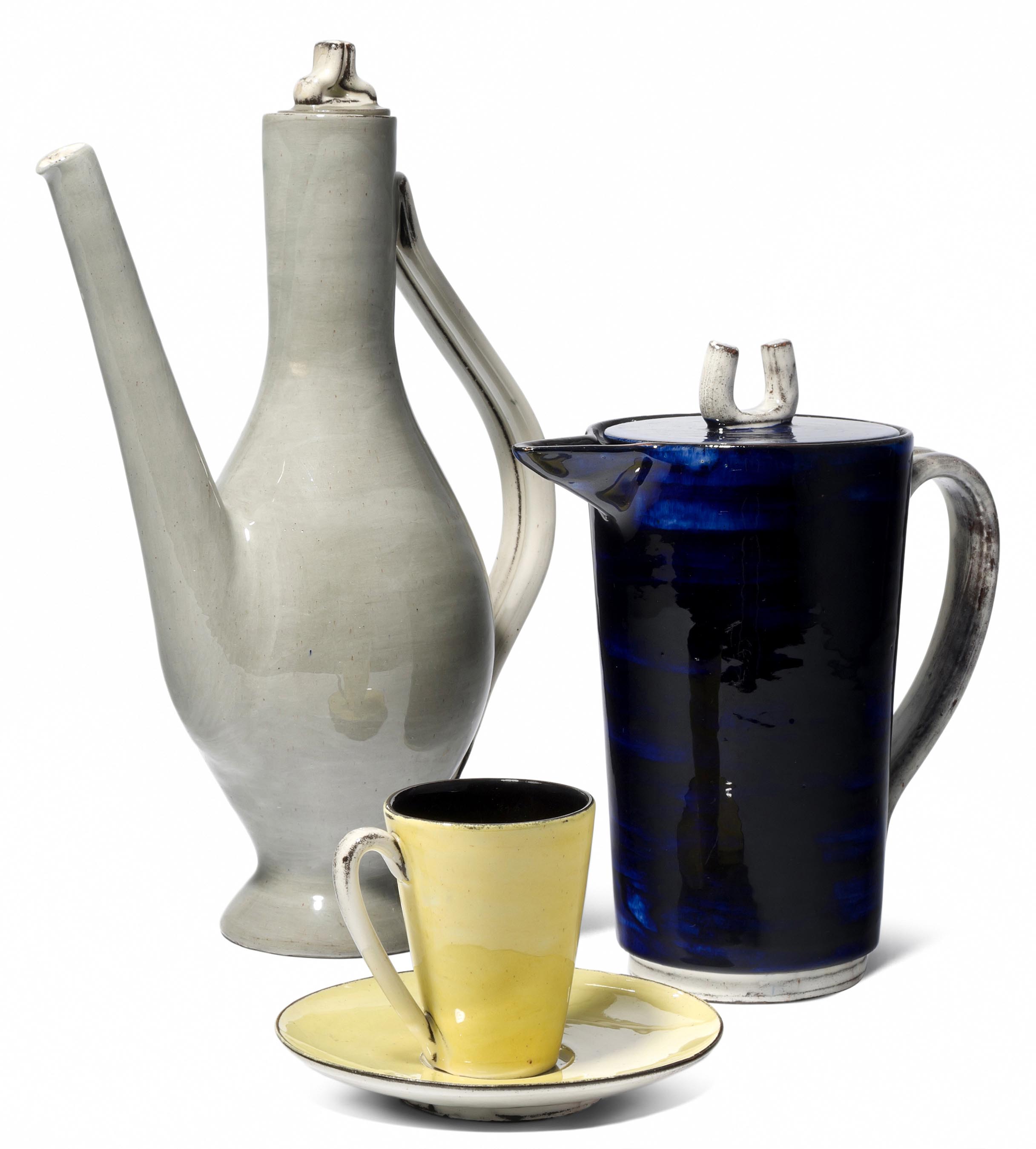 Keramik, bemalt. Bezeichnet: Künstlermarke (Fisch). Bestand: 1 Kaffeekanne, 1 Milchkanne, 1 Cremier, 6 Tassen mit U'tassen.