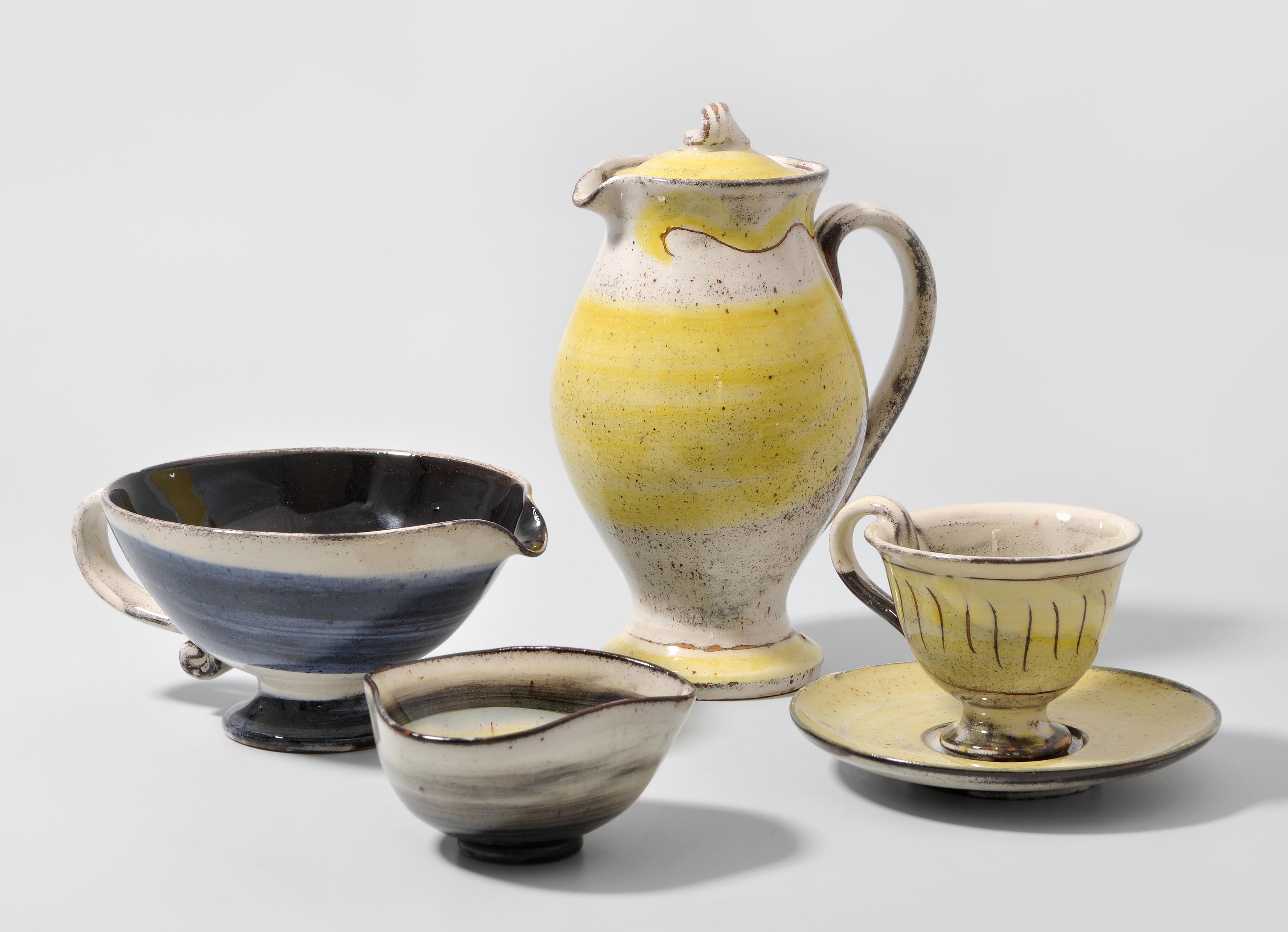 Keramik, bemalt. Bezeichnet: Künstlermarke (Fisch). Bestand: 1 Deckelkrug, 1 Cemier, 1 Zuckerschale, 8 Tassen mit U'tassen.