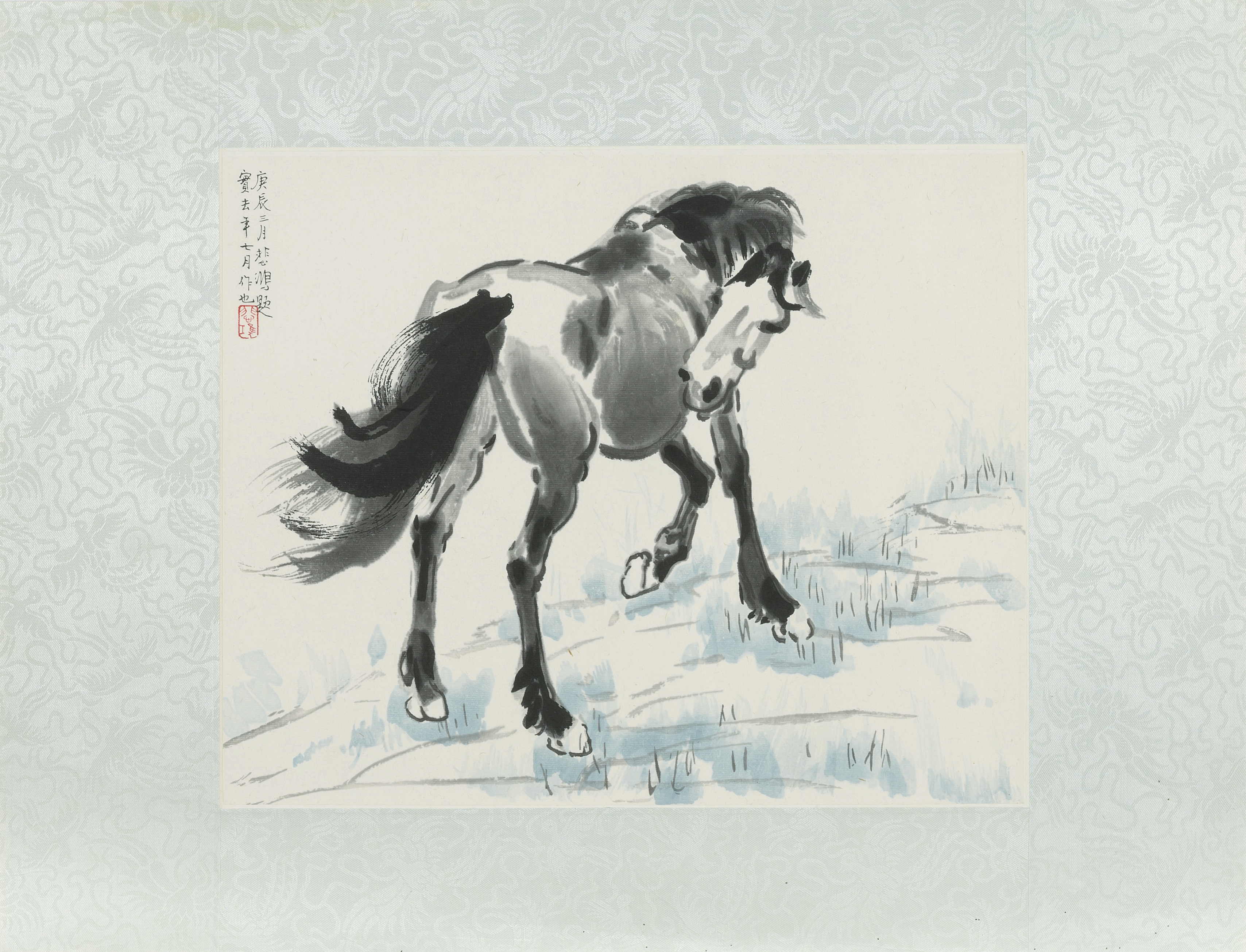 China. Tusche und Farbe auf Papier. Sich umschauendes Pferd. Signiert und datiert März 1940. 29,5x36. Aufgezogen. 43x55,5 cm. Gerahmt.