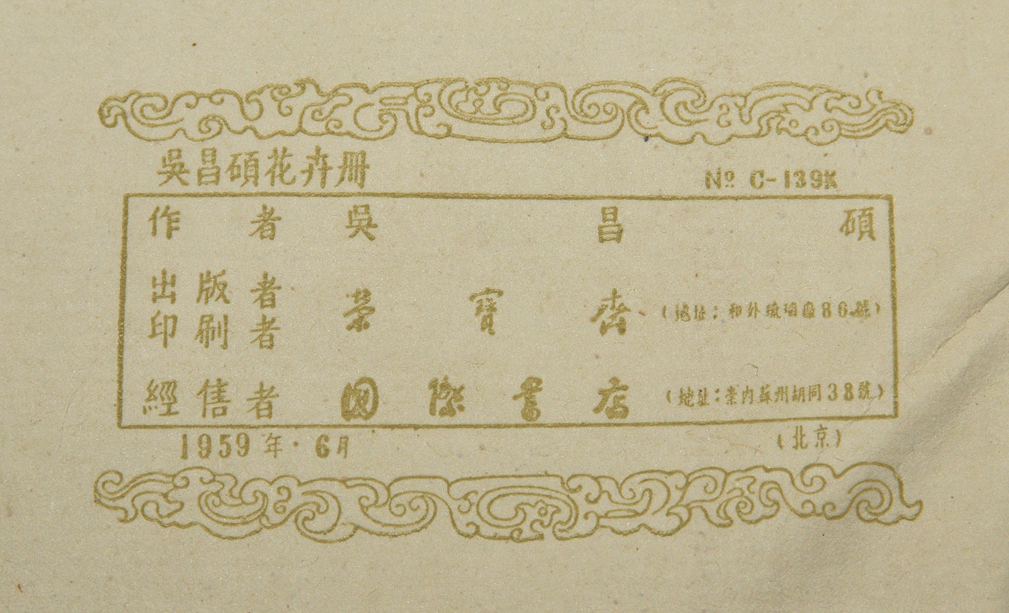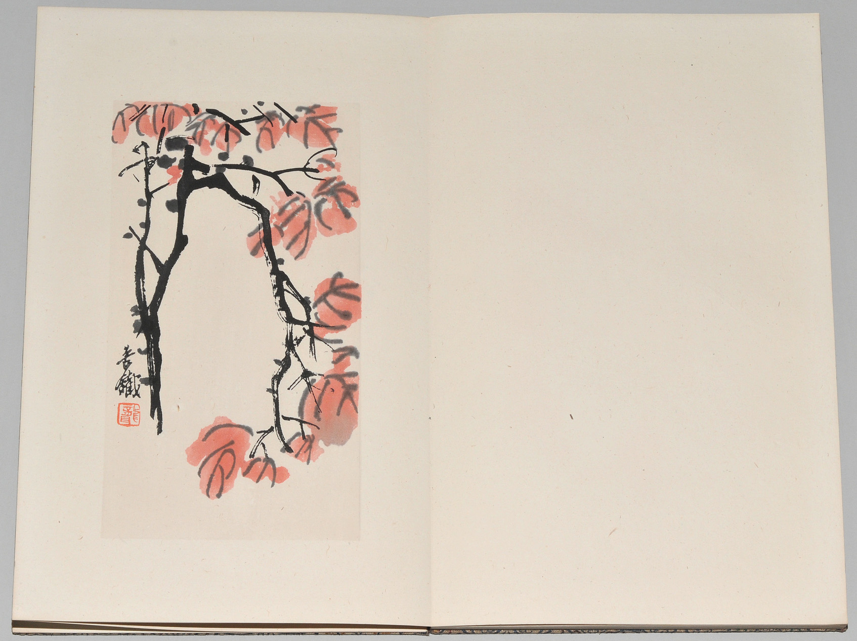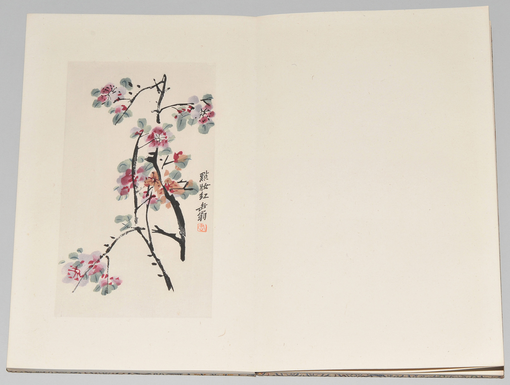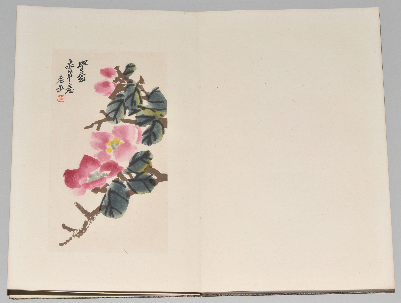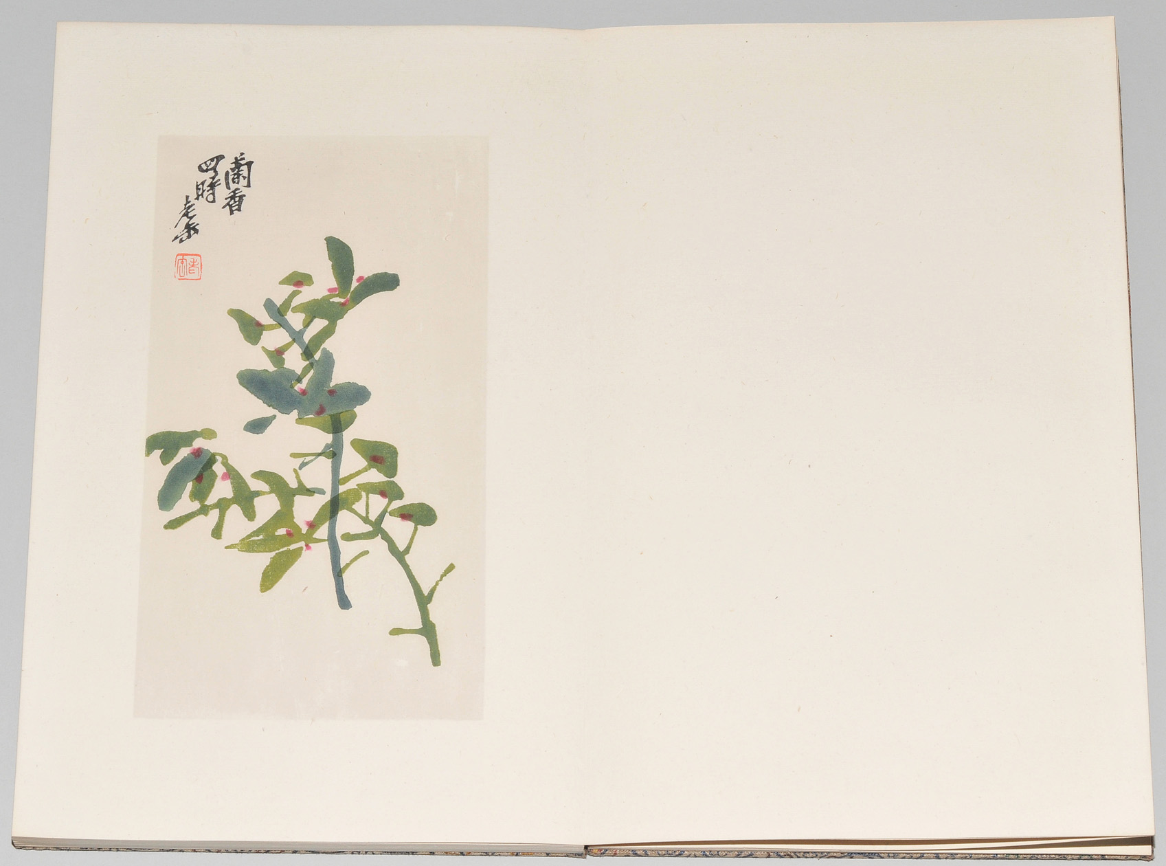 Beijing, Rongbaozhai, 1959. Blumen und Gräser-Album. Leporello-Album mit zwölf Farbholzschnitten in Seidenbrokateinband. Einband leicht vergilbt, sonst guter Zustand. 32x20.5 cm.