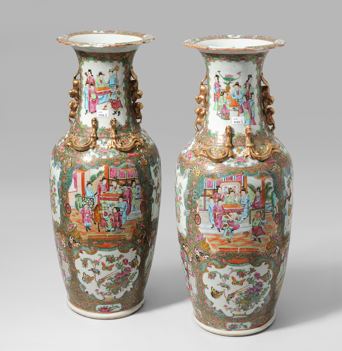 China, 19.Jh. Porzellan. Kanton-Rose. Vergoldete Drachen auf Schulter, Löwen auf Hals reliefiert. Erhaltungsmängel. H 64 cm.