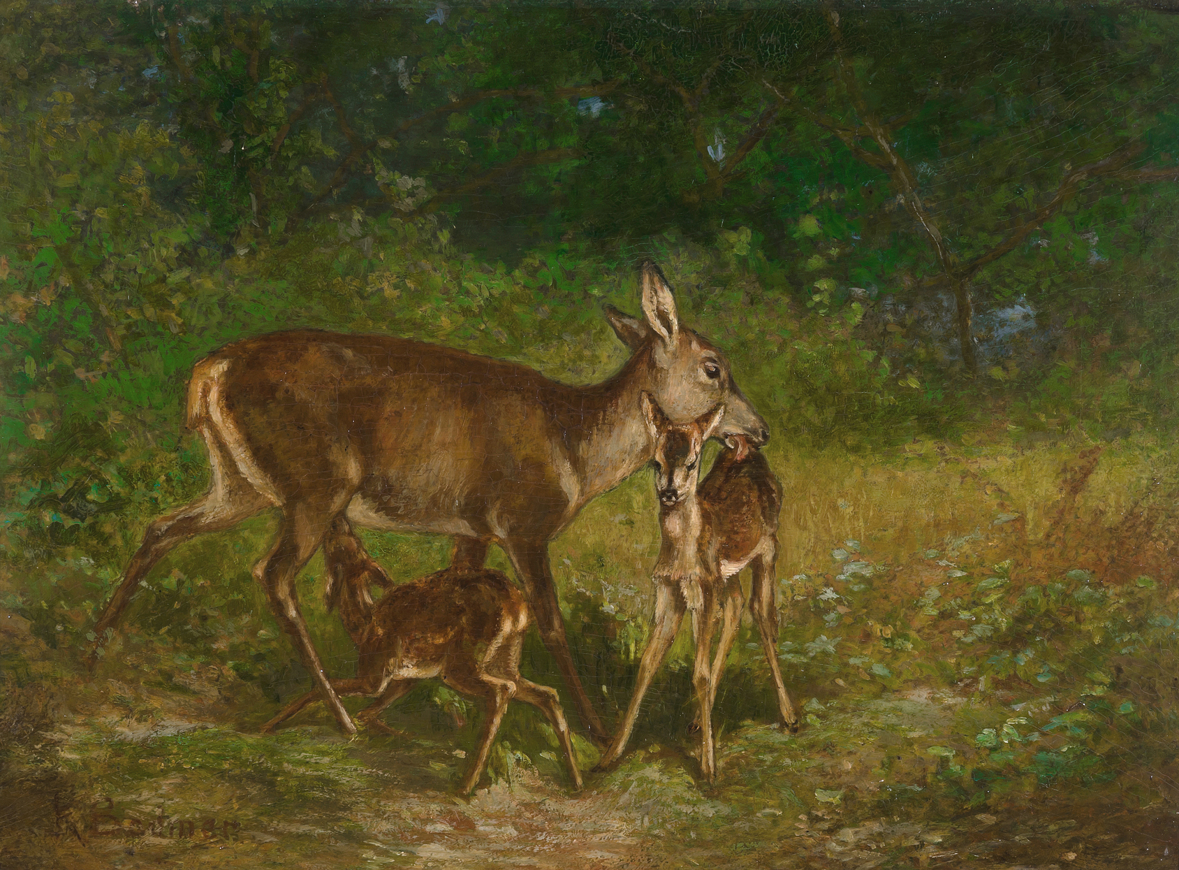 Rehgeiss mit ihren zwei Kitzen. Öl auf Holz. Unten rechts signiert. 24x32,5 cm.