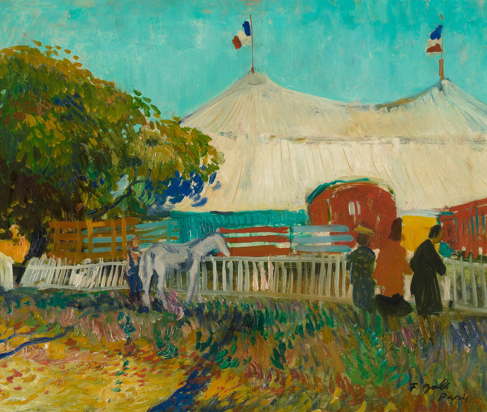 Das hier angebotene Gemälde kann um 1937/38 datiert werden und stammt aus einer weniger bekannten Schaffensperiode des Künstlers. Seit Anfang der 30er Jahre interessierte sich François Gall bereits für die soziale Wirklichkeit. Er malte, zuerst in dunklen Tönen, später mit fauvistischen Farben Strassenkünstler, Fahrende, arme Menschen, Zirkus- und Dorfszenen, mit Märkten und Volkstänzen. Gall kämpfte sein Leben lang gegen soziale Missstände, Armut und Ausgrenzung. Er half mehreren von seinen Landsleuten Ungarn und Rumänien zu verlassen, nahm sie bei sich in Paris auf, bevor sie weiter nach Kanada, USA, Israel oder Mexiko reisten. Er engagierte sich auch besonders für die Rechte der Künstler und die Meinungsfreiheit.