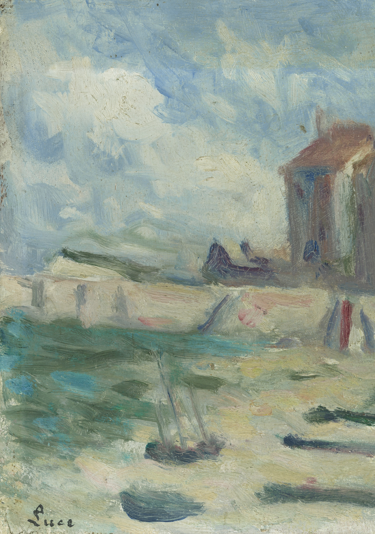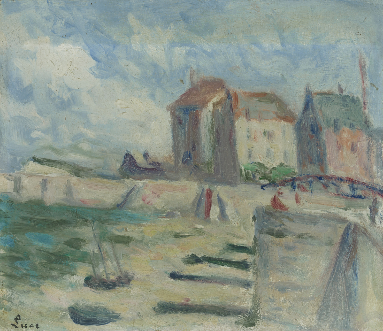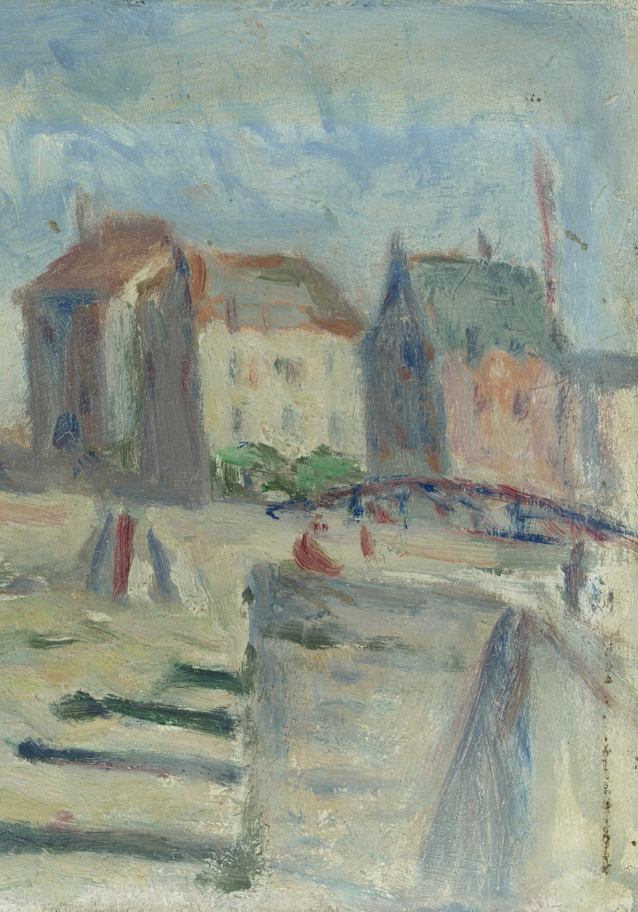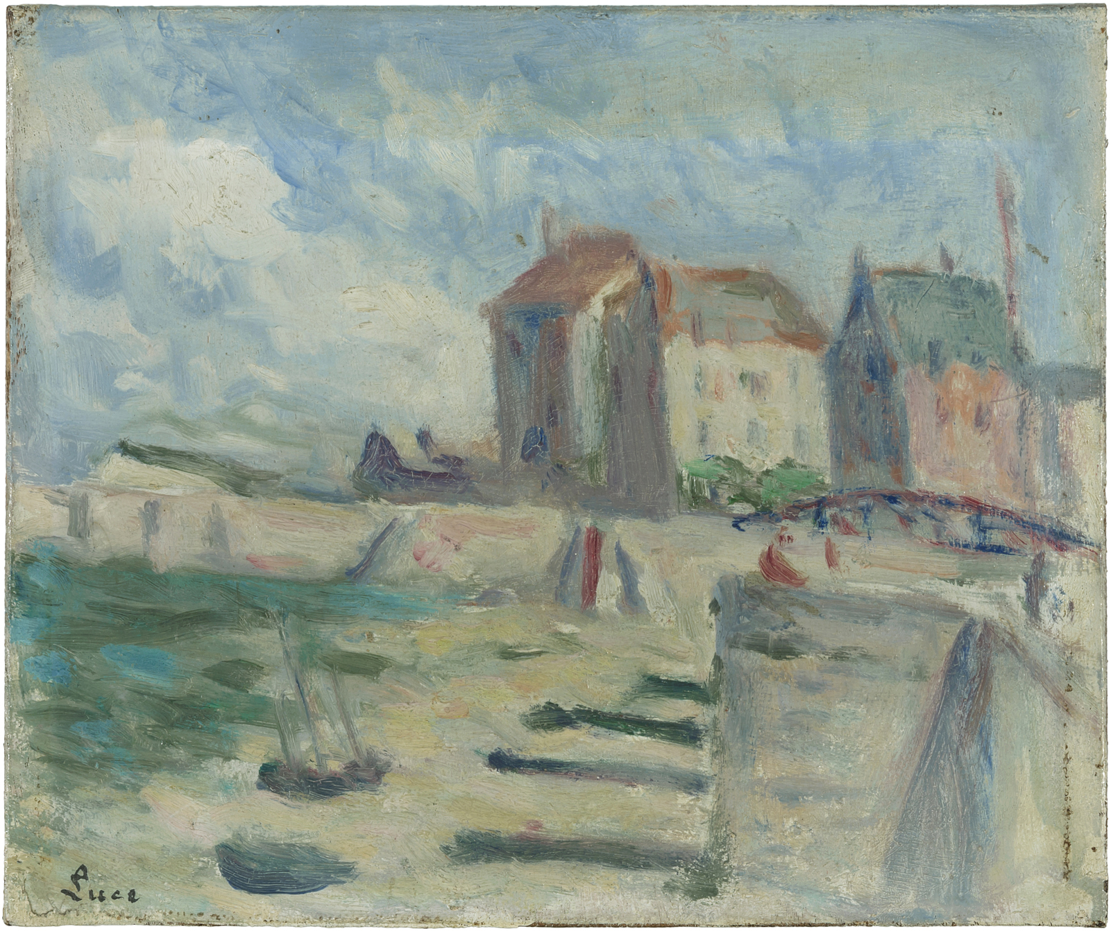 "Le bassin au Tréport". Öl auf Holz. Unten links signiert. Auf der Rückseite Stempel der Galerie "Jacques Rodrigues-Henriques, 20 rue Bonaparte, Paris (VIe)", sowie mit Bleistift betitelt. 15,8x19 cm.