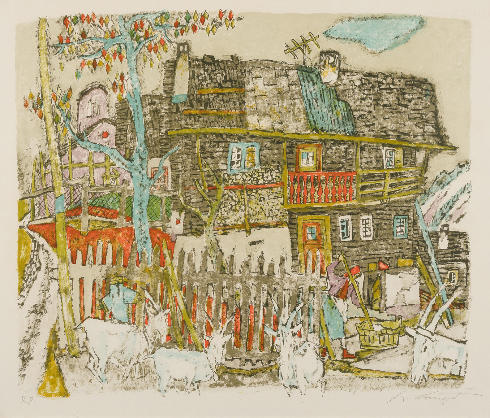 Bauernhaus in Leis. 1975. Farblithographie, K.P. Unten rechts in Bleistift signiert und datiert. Blattgrösse 56,5x67,5 cm. Gerahmt. -Blatt leicht gebräunt. Hellerer Lichtrand. Ränder und Ecken leicht bestossen.