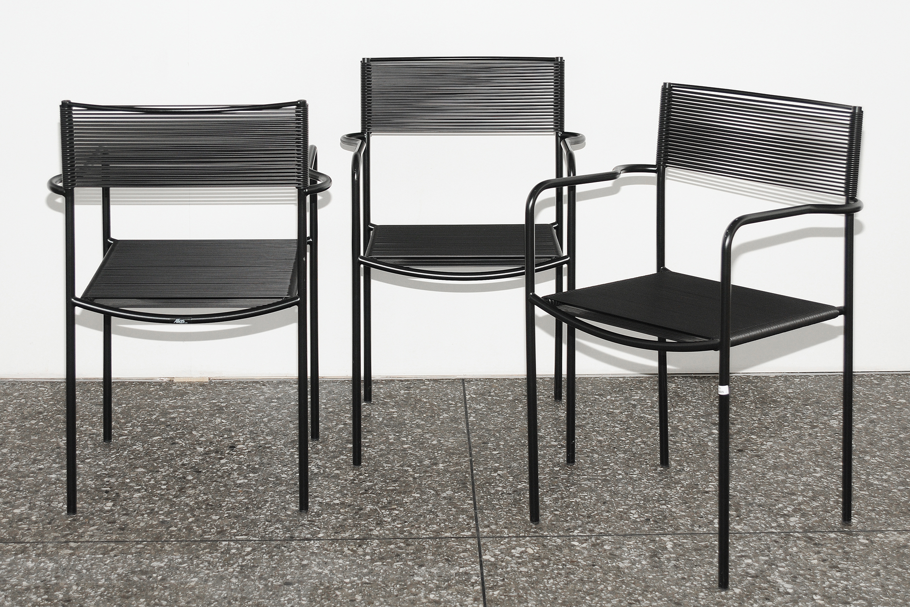 Drei Armlehnstühle Spaghetti, Entwurf 1979. Ausführung Alias. Konstruktion aus schwarz lackiertem Stahl und PVC-Schnur. Gebrauchsspuren. Guter Zustand. 84x54x42 cm.