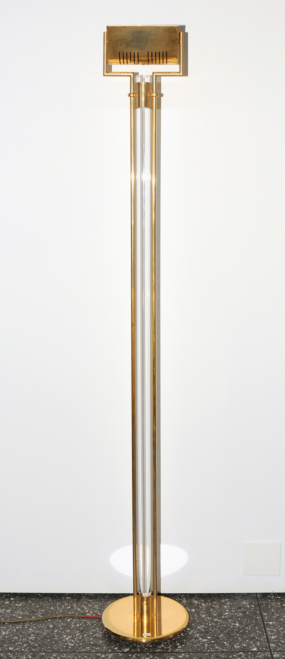 Stehleuchte. Konstruktion aus vergoldetem Metall und Plexiglasrohr. Funktionsfähig. Gebrauchsspuren. Guter Zustand. H 187 cm.