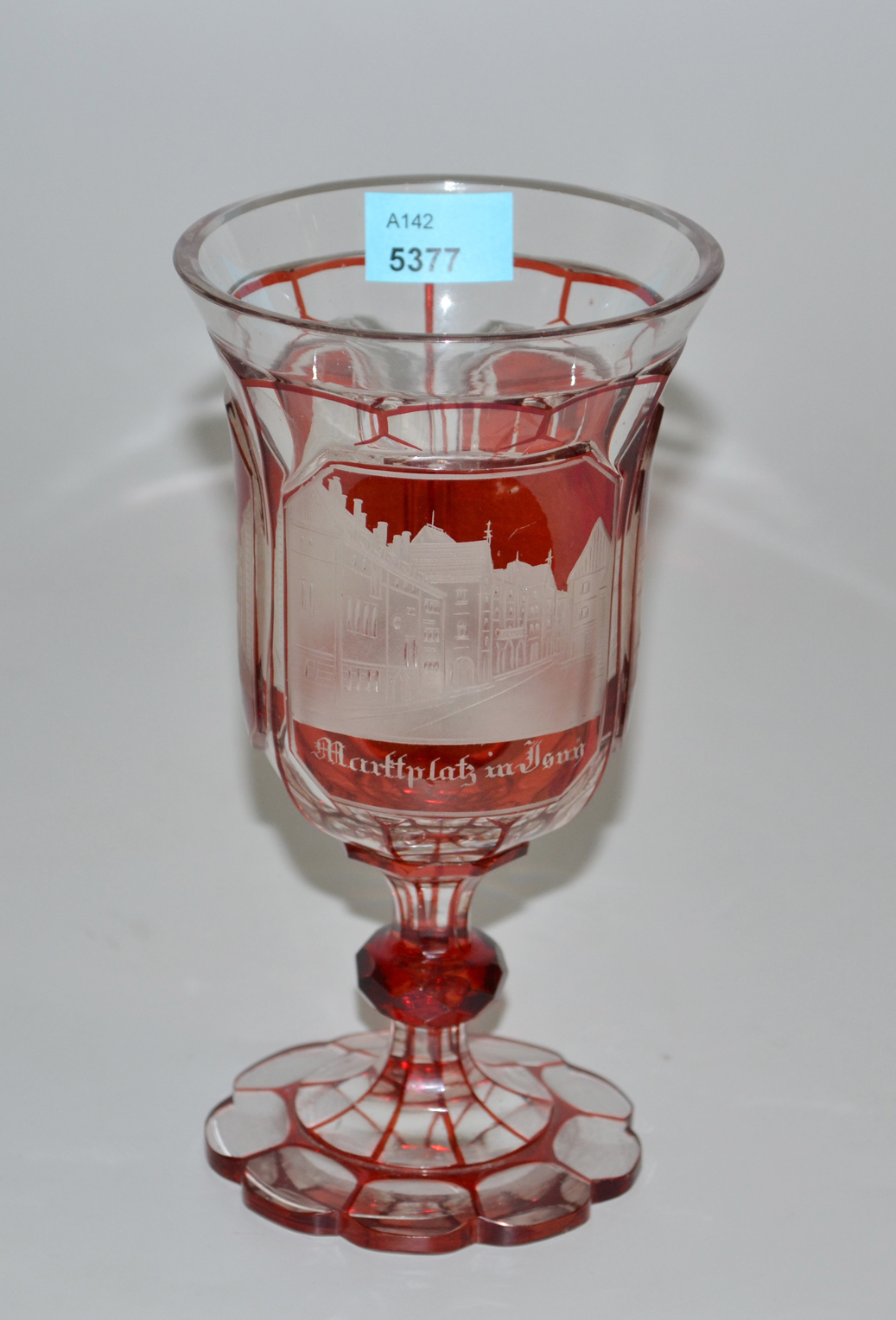 Böhmen, Ende 19.Jh. Farbloses Kristallglas, rot lasiert. Glockenförmige Kuppa auf hohem Fuss mit Nodus, facettiert geschliffen. Drei Bildfelder mit Darstellungen der Badeorten von Isny in Mattschnitt. H 16,5 cm.
