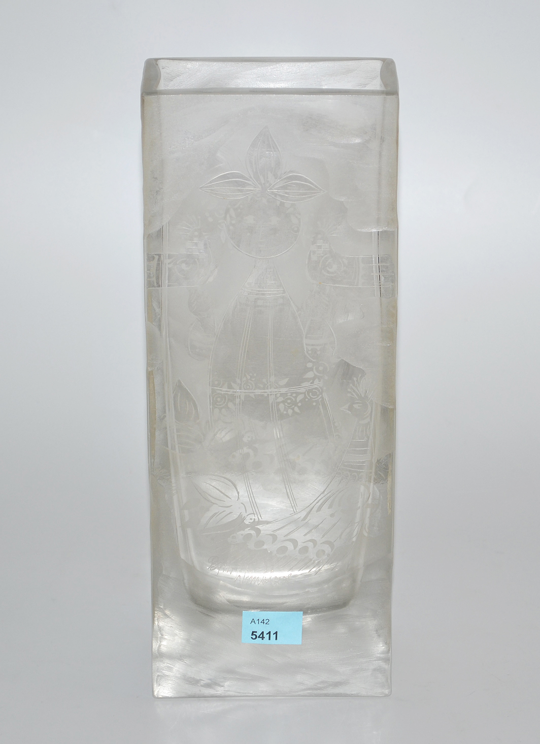 Um 1970. Entwurf von Bjorn Wiinblad. Farbloses Kristallglas. Figürlicher Dekor in Mattschnitt. H 26 cm.