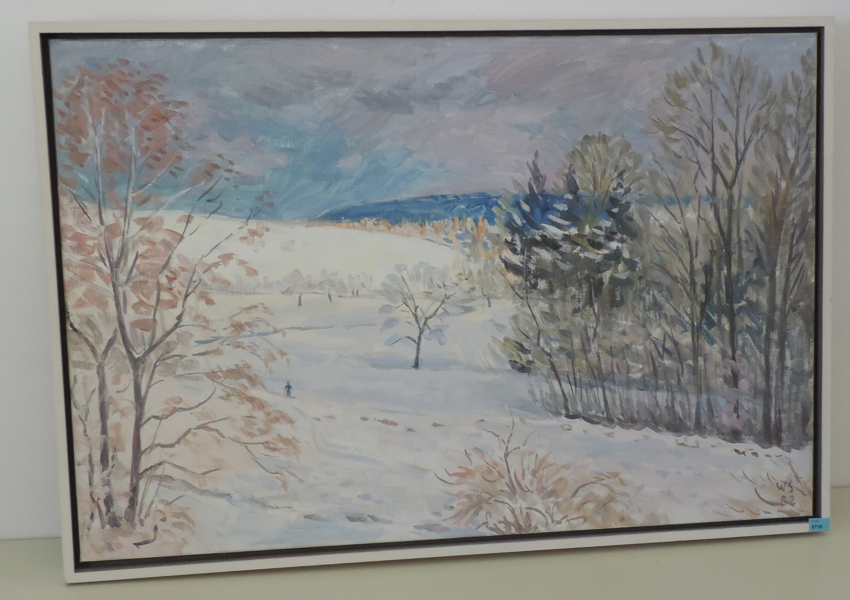 "Neuschnee", 1982. Öl auf Leinwand. Unten rechts monogrammiert und datiert, verso auf Künstleretikett bezeichnet. 54x81 cm.