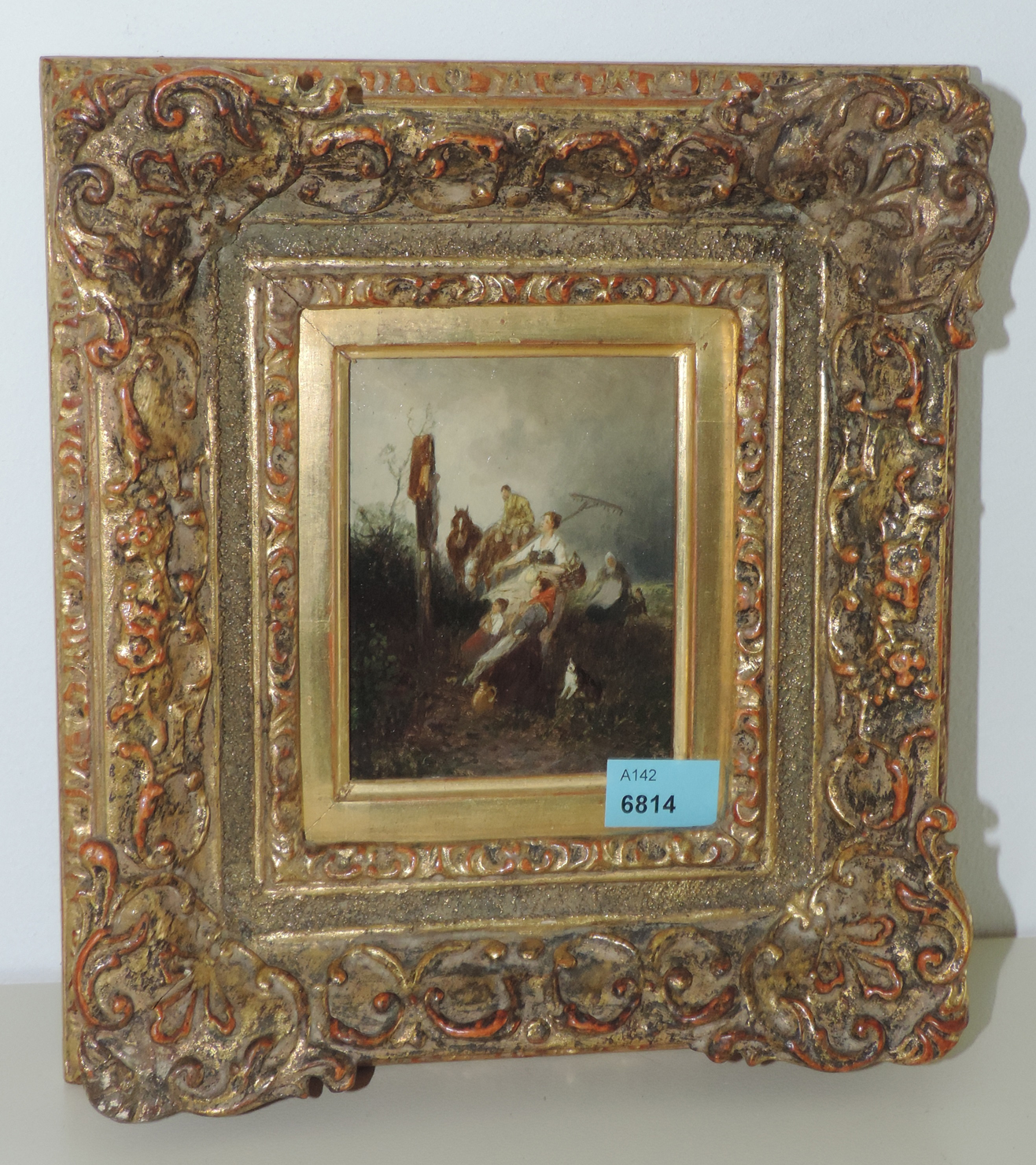 "Vom Gewitter überrascht". Öl auf Karton. Unten links signiert, verso betitelt. 9,8x7,6 cm.