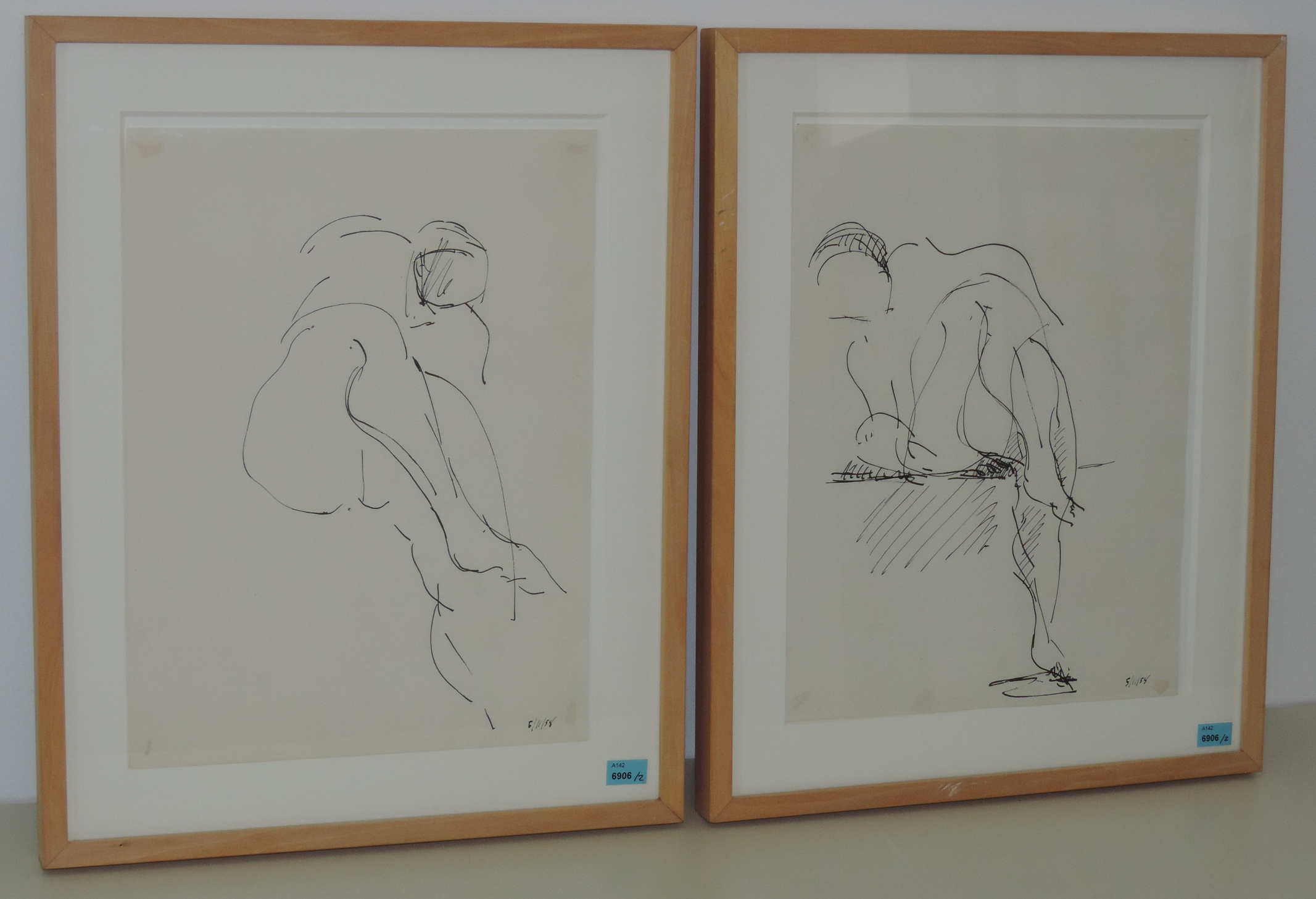 Zwei Studien: Weibliche Akte. 1958. Tusche auf Papier. Jeweils unten rechts datiert: "5/11/58". Blattgrössen je 35,3x26,5 cm. Beide gerahmt.