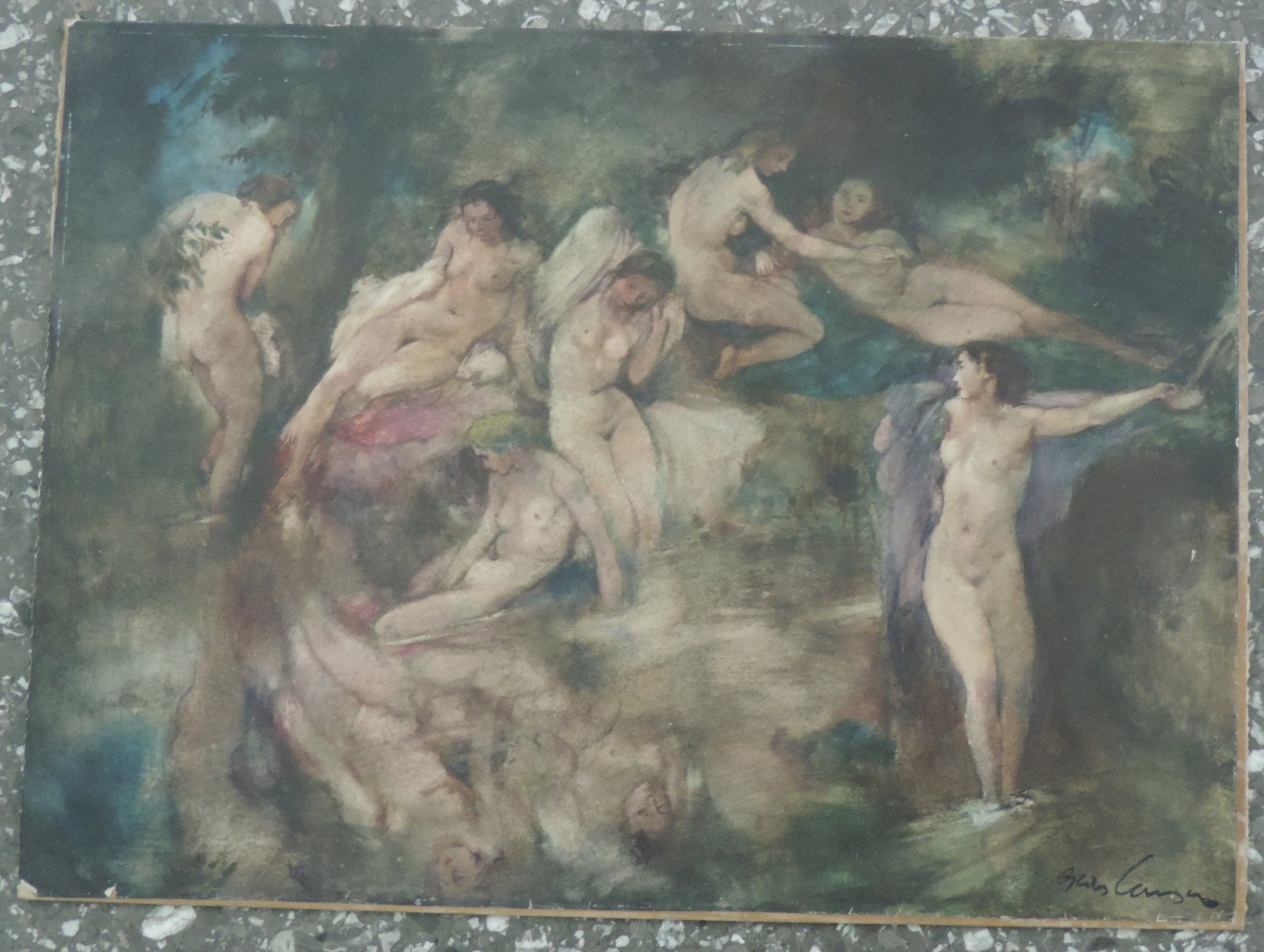 "Badende Mädchen". Mischtechnik auf Papier. Unten rechts signiert. Verso betitelt. Blattgrösse 36,3x49,5 cm.
