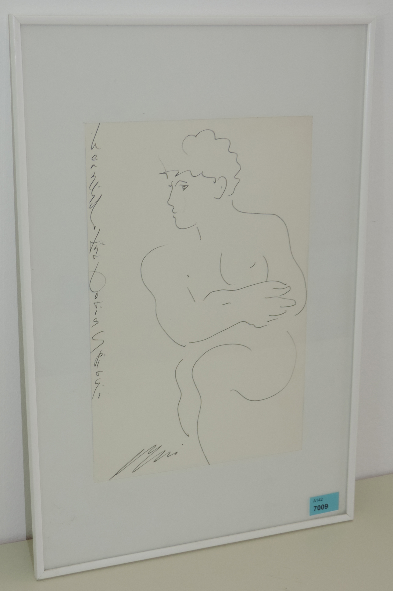 Männlicher Akt. Tusche auf Papier. Unten links signiert. Mit Widmung. Lichtmass 23,7x15,7 cm. Gerahmt.