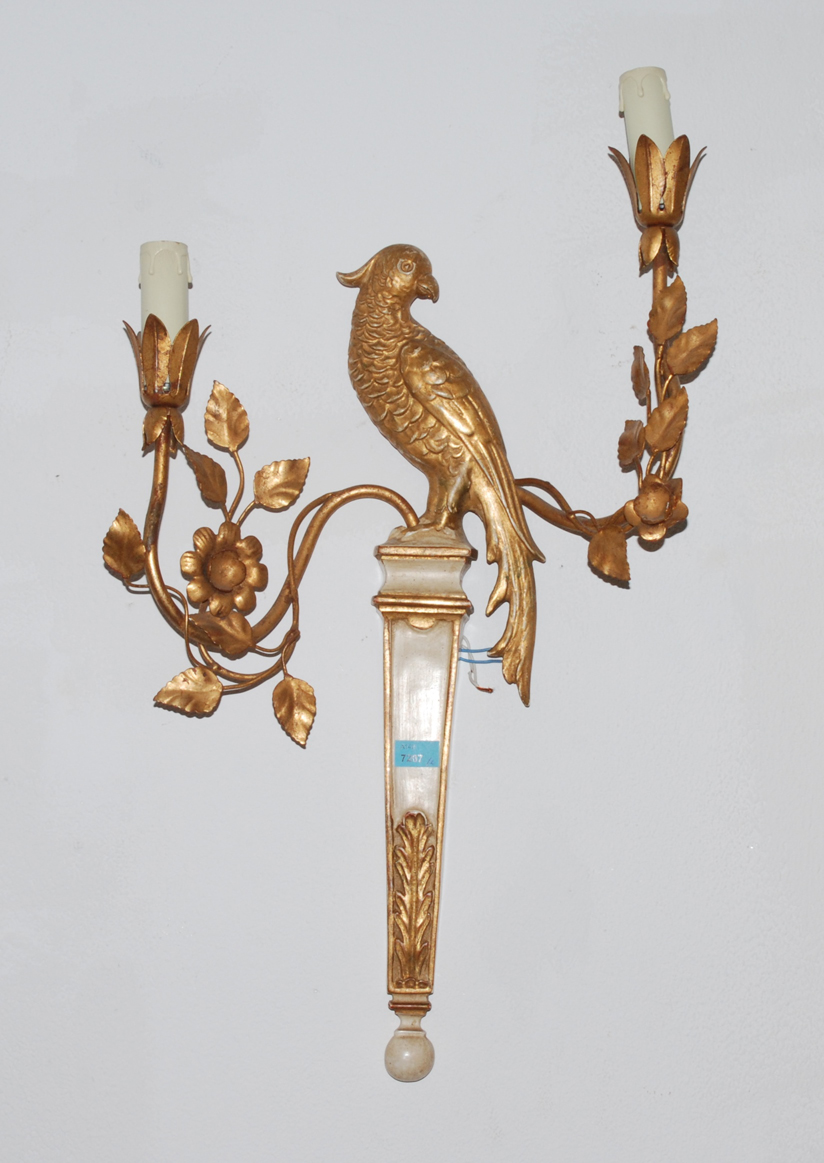 Louis XVI-Stil, neuere Arbeit. Holz gefasst und Metall. Vogel auf Pilaster sitzend mit zwei Lichtarmen. Weisser Grund mit vergoldeten Schnitzereien. Elektrifiziert, zu revidieren. H 58 cm.