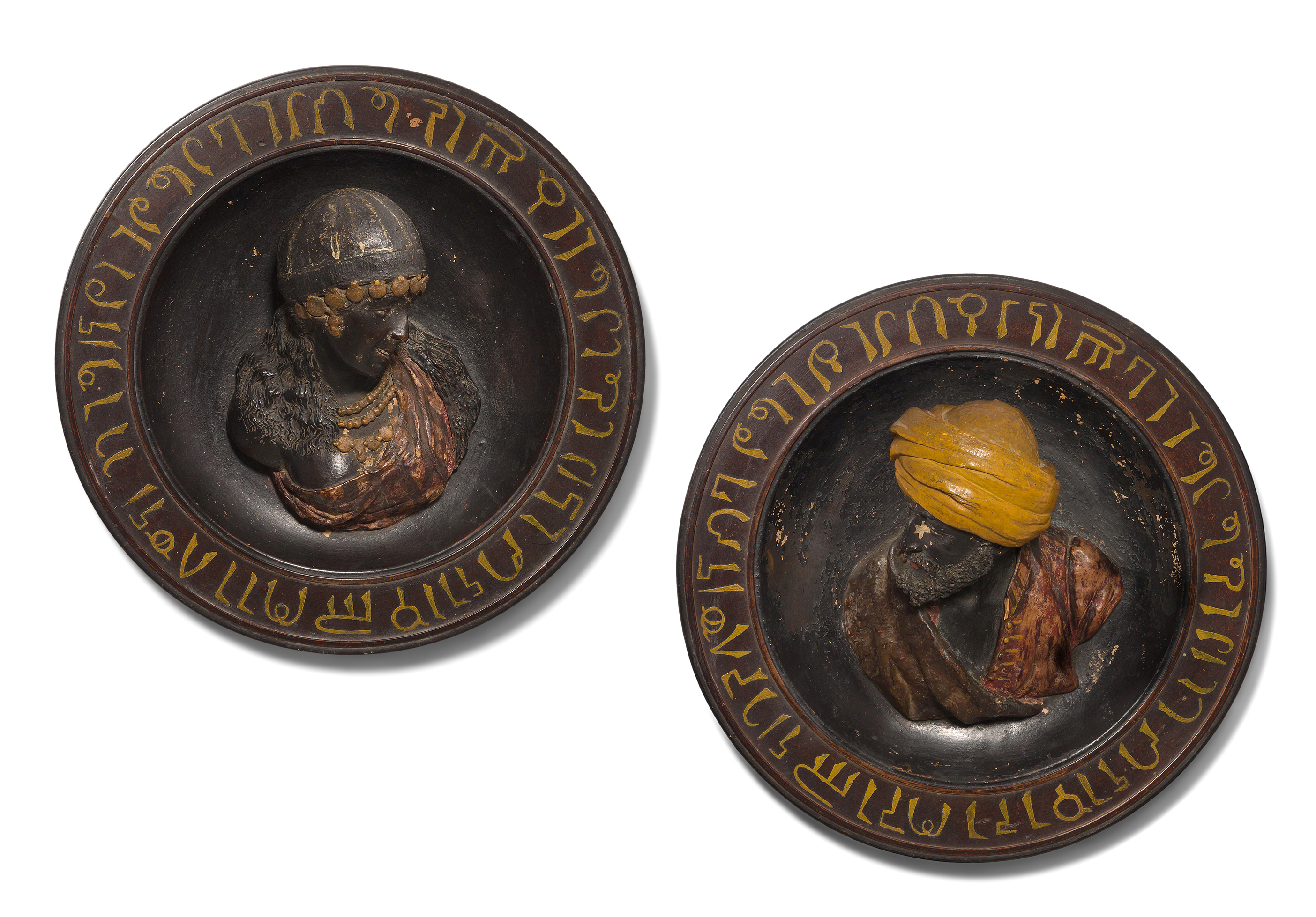 Wien, um 1890. Terrakotta, im Spiegel Büste eines Arabers bzw. einer Araberin im Hochrelief, polychromiert. Auf dem Rand Inschrift. Bezeichnet: F. GOLDSCHEIDER WIEN, VERVIELFÄLTIGUNG VORBEHALTEN. D 30 cm.