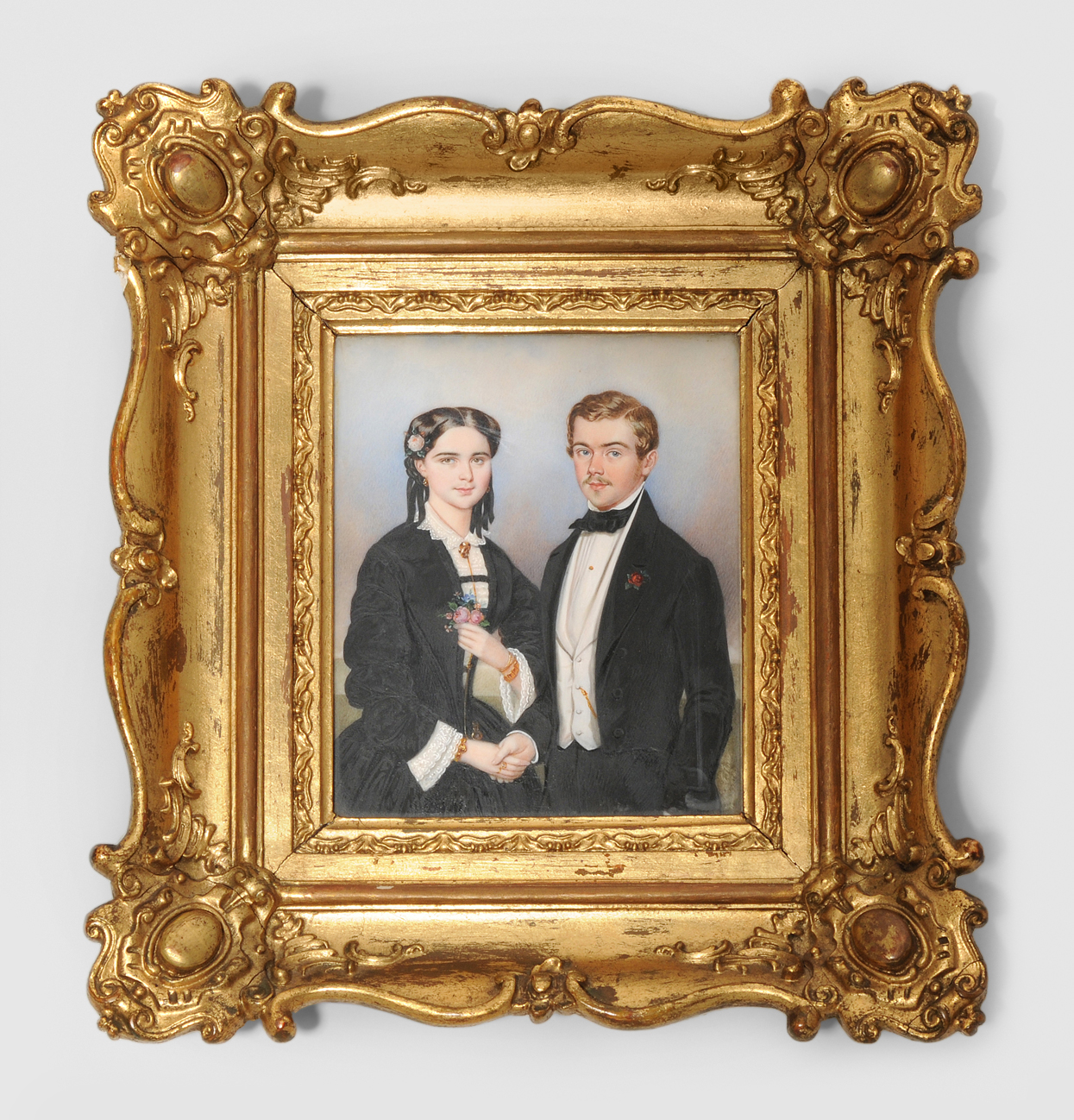 1854. Gouche auf Elfenbein, rechteckig. Eheleute darstellend vor Himmelshintergrund. Rechts unten signiert: Albert Theer 1854, (Johannisberg 1815–1902 Wien). Gefasst. 13x10,5 cm.