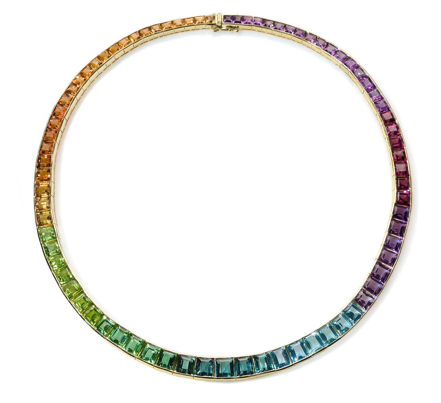 750 Gelbgold. Rivière 4 gelben Topasen, ca. 1.80 ct. 21 Citrinen, ca. 10.50 ct. 7 Peridots, ca. 8.40 ct. 5 grüne Turmaline, ca. 5.50 ct. 5 blaue Turmaline, ca. 5.50 ct. 6 blaue Topase, ca. 7.20 ct. 7 Amethyste, ca. 3.50 ct, 7 rote Granate, ca. 4.90 ct. 17 Amethyste, ca. 8.50 ct. Alle Edelsteine in Carréschliff und Kanalfassung. L 40 cm. 66,6 g.