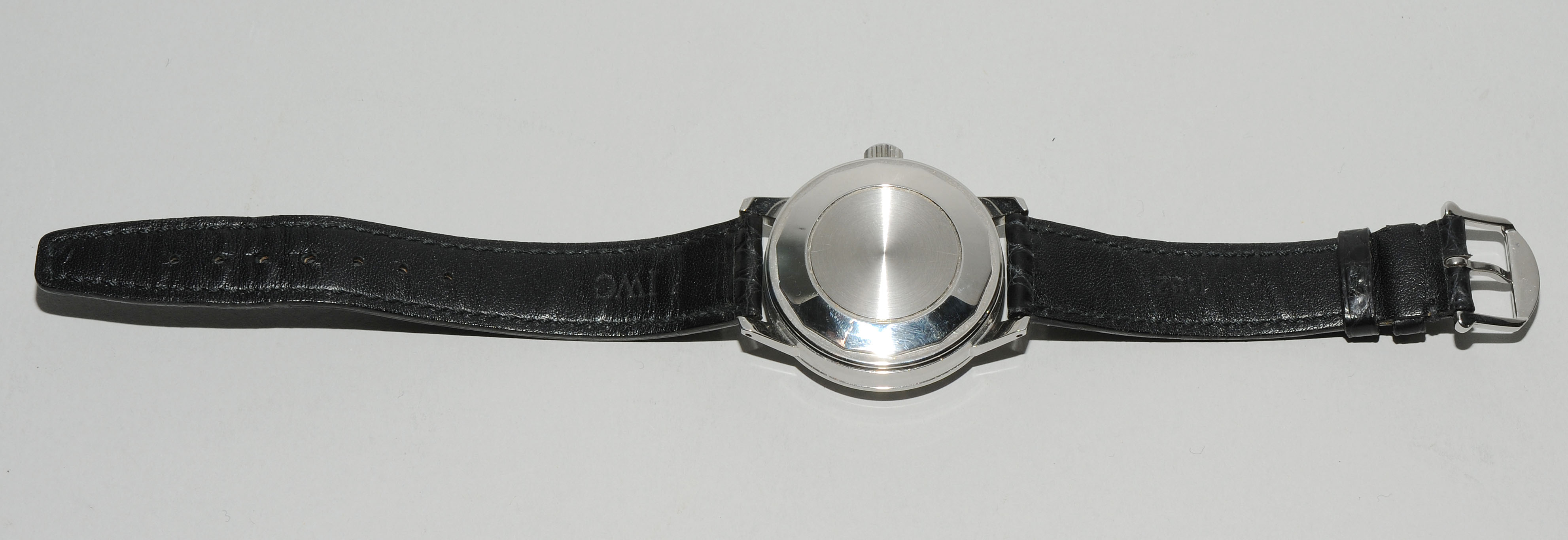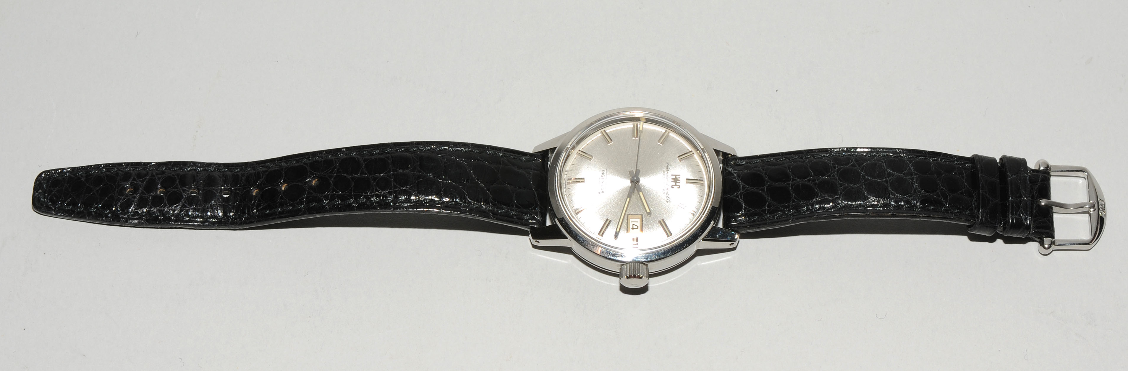 Runde, automatische Herrenarmbanduhr 1971 in Stahlgehäuse. Boden verschraubt, Werknummer 2037890, Kaliber 8541B, Gehäusenummer 2012110, Referenznummer 866A, D 37 mm. Silberfarbenes Zifferblatt mit aufgesetzten, silberfarbenen Stundenleuchtindizes, schwarze Minuten-, Sekundenindizes. Silberfarbene Stab-Leuchtzeiger, zentraler Sekundenzeiger. Datumsfenster und Krone bei 3 Uhr. Schwarzes Lederarmband mit Dornschliesse. Neuwertig, kaum Gebrauchsspuren.