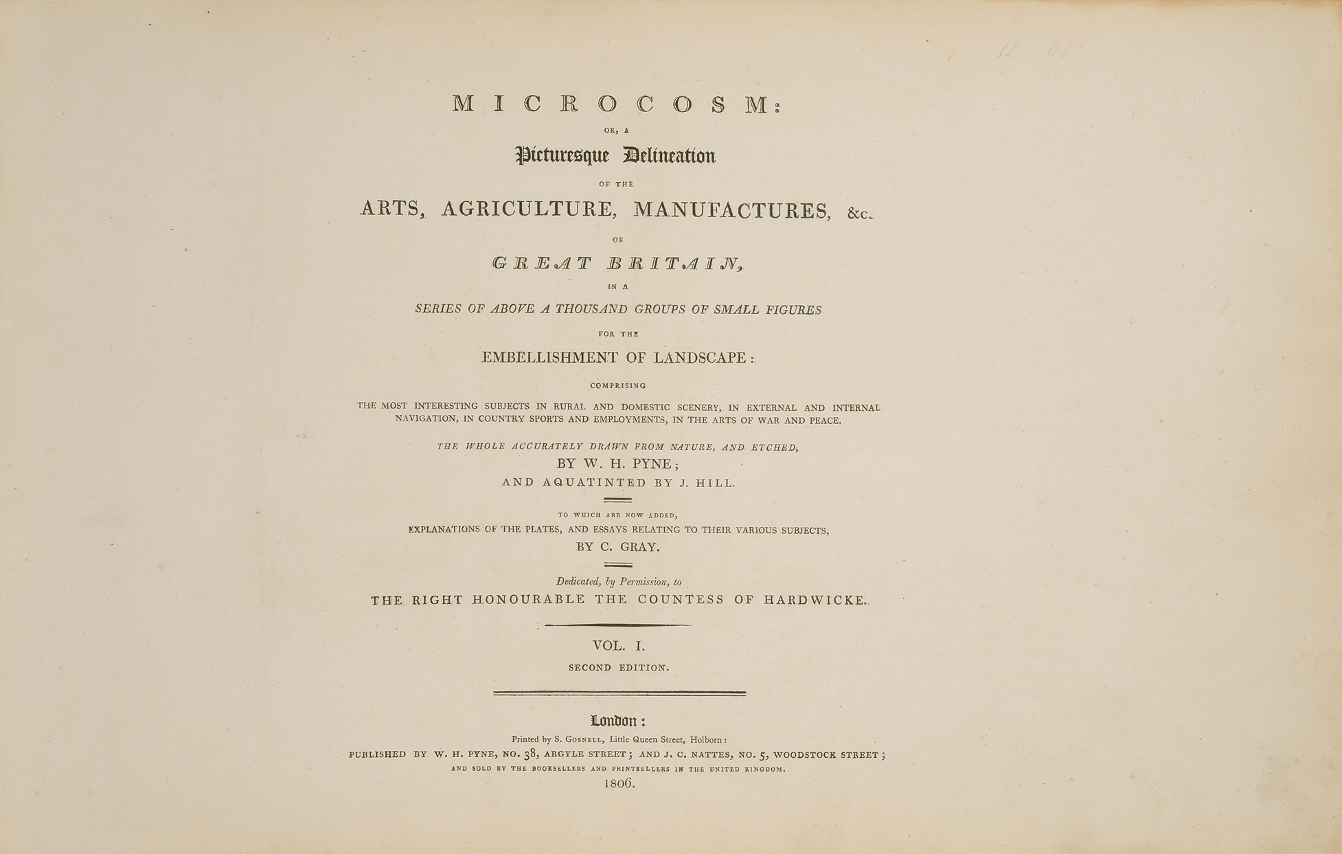 Microcosm: or, a picturesque delineation of the arts, agriculture, manufactures, &c. of Great Britain : in a series of above a thousand groups of small figures for the embellishment of landscape... To which are now added, explanations of the plates...by C. Gray. Second edition. London: W.H. Pyne (gedr.v. S. Gosnell), 1806. 2 Bde., qu. Fol. Bd. 1: (2) Bl., 30 S., 60 Tafn.; Bd. 2: (2) Bl., 36 S., 60 Tafn. Hldr. Bd. (best.). - Besonders am Anfang und gegen den Schluss der Bände stärker stock- und fingerfleckig.