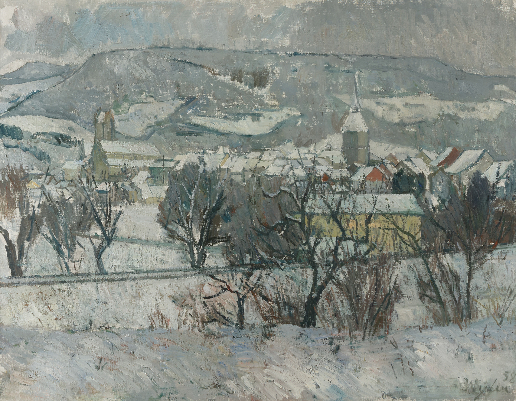 "Stadt Aarau im Winter", 1958. Öl auf Leinwand. Unten rechts signiert und datiert, verso auf Etikett bezeichnet. 89,5x117 cm.