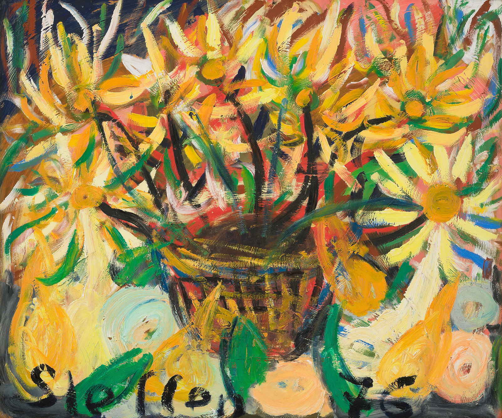 Blumenkorb, 1976. Öl auf Hartfaserplatte. Unten signiert und datiert. 70x83 cm.