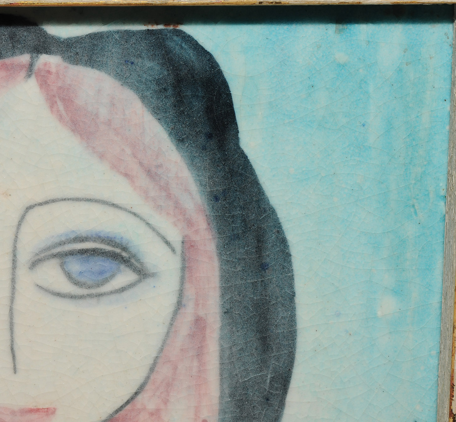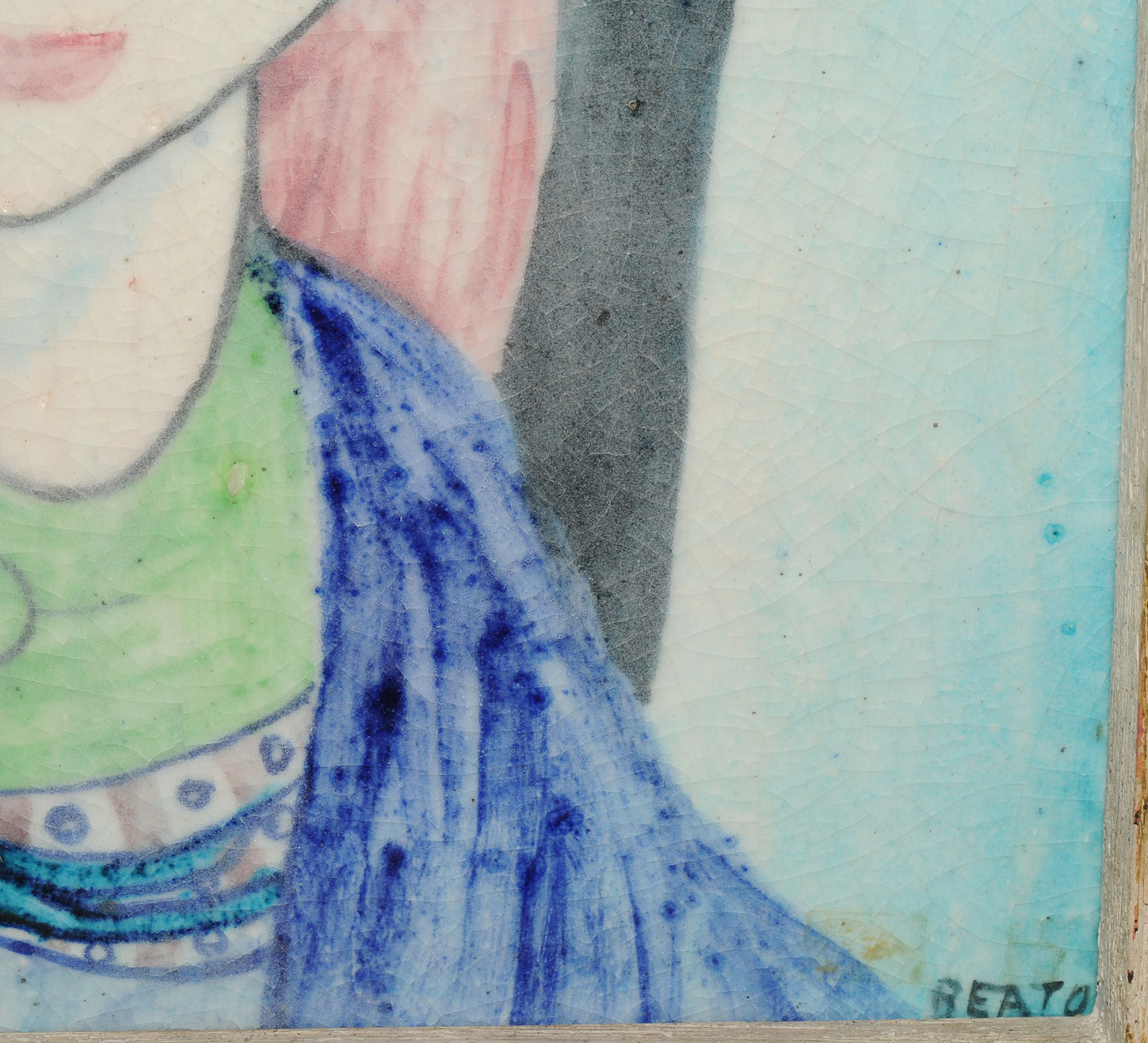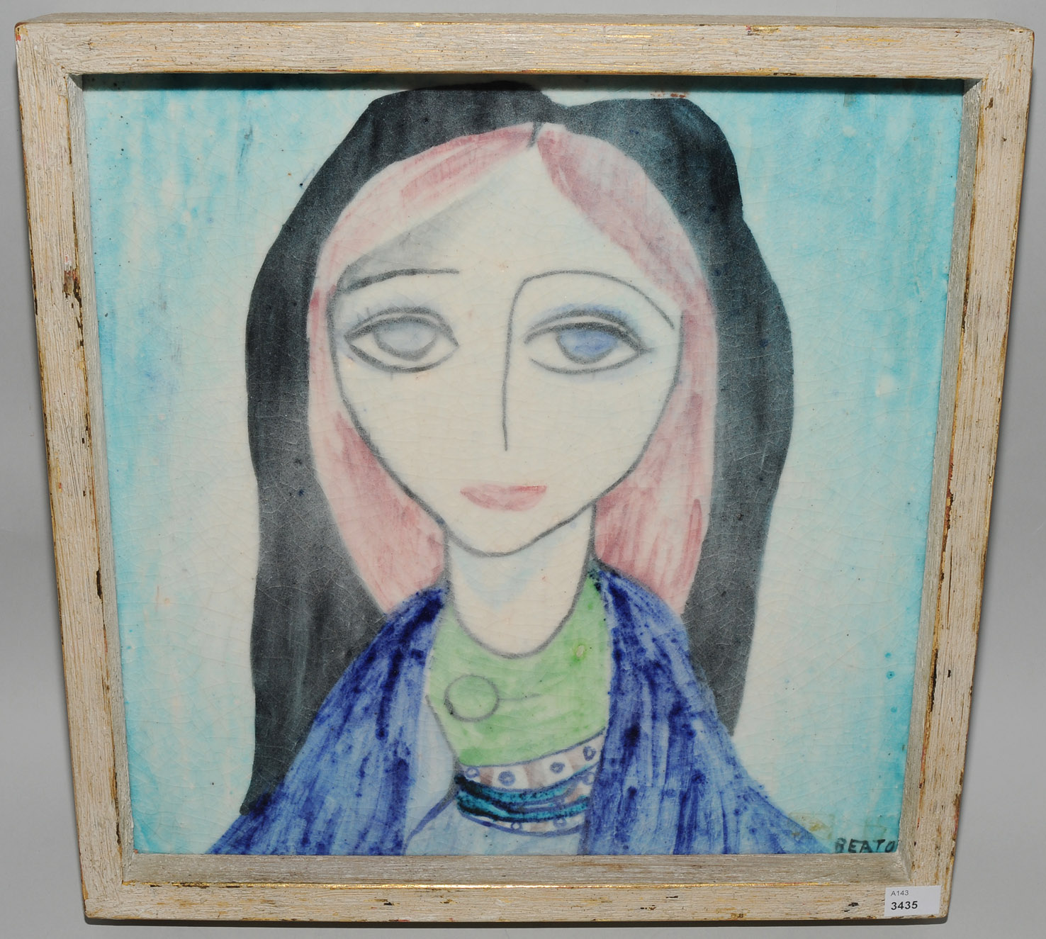 Portrait eines Mädchens. Keramikplatte. Unten rechts bezeichnet: "Beato N.". 36,5x36,5 cm. Gerahmt. -Krakeluren. Bestossungen an den Rändern. Hick an der linken, unteren Ecke.