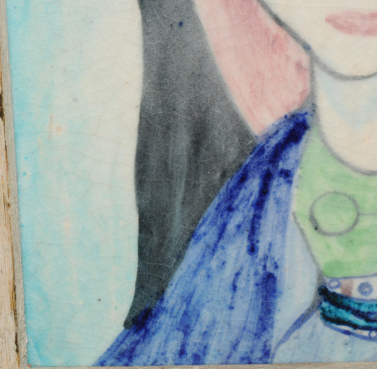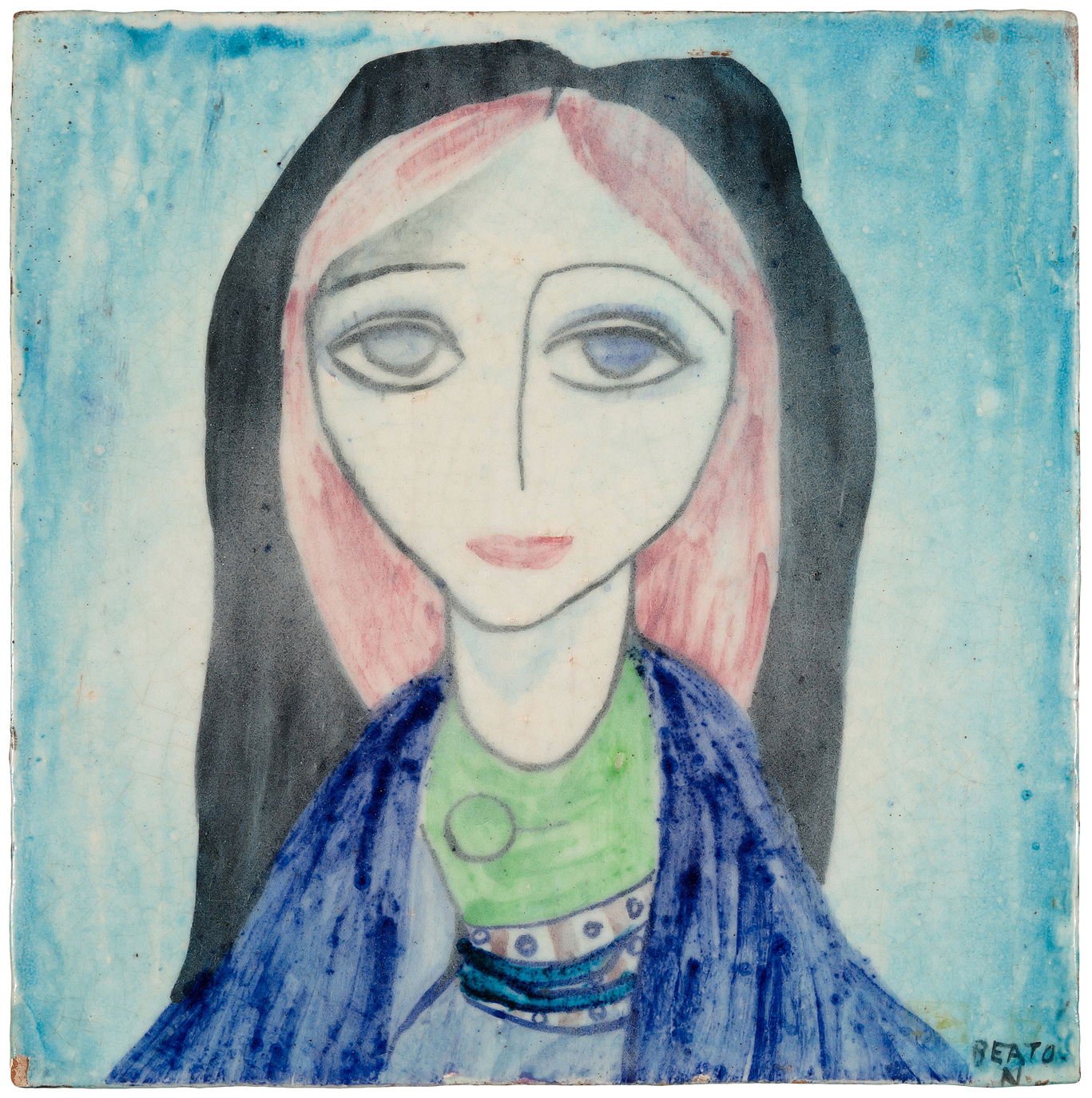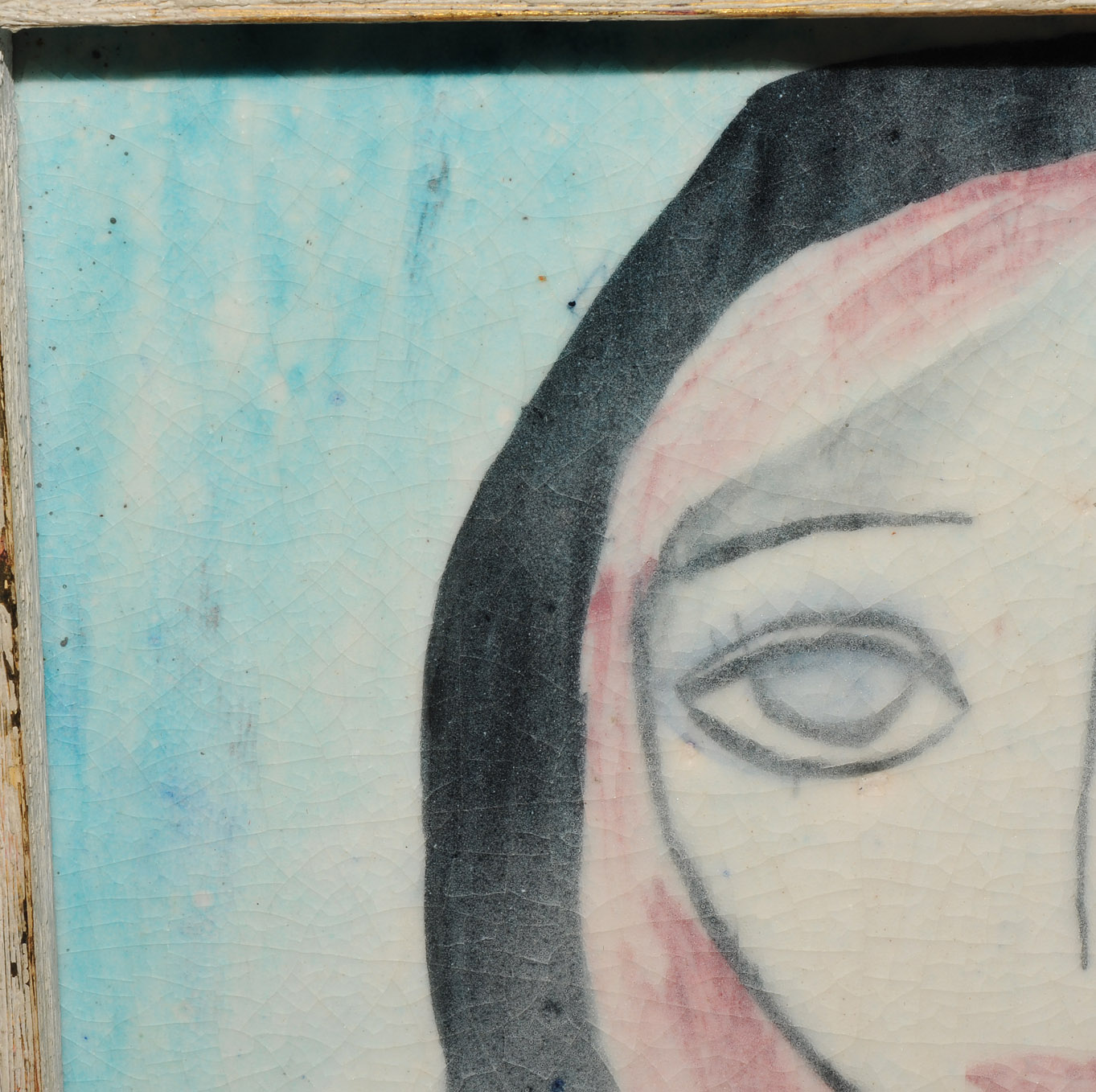 Portrait eines Mädchens. Keramikplatte. Unten rechts bezeichnet: "Beato N.". 36,5x36,5 cm. Gerahmt. -Krakeluren. Bestossungen an den Rändern. Hick an der linken, unteren Ecke.