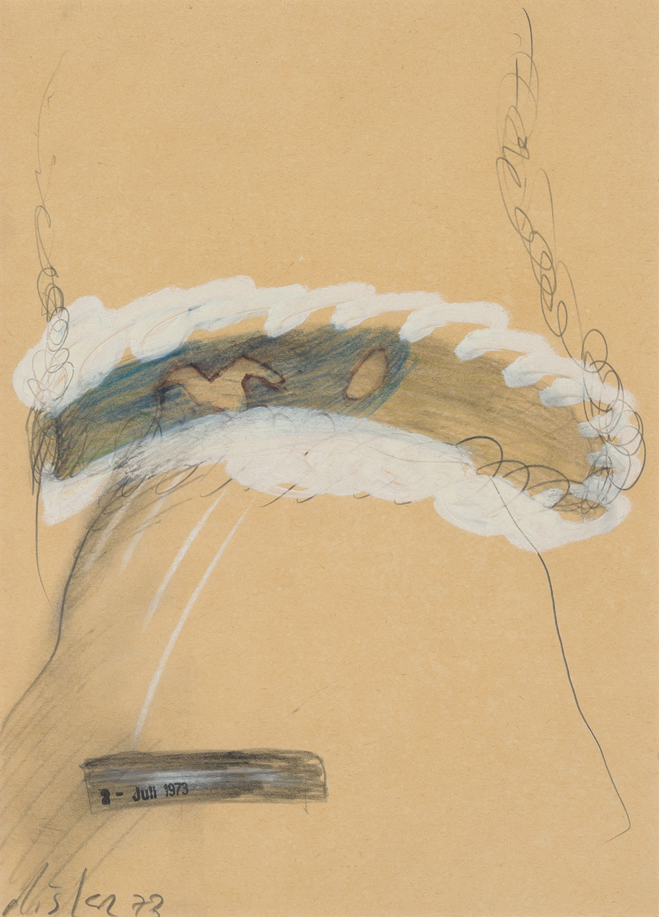 8. Juli 1973. Mischtechnik auf Papier. Unten links in Bleistift signiert und datiert. Blattgrösse 29,6x21 cm. Gerahmt. -Blatt gebräunt. Verso an allen Rändern an Passepartout montiert.