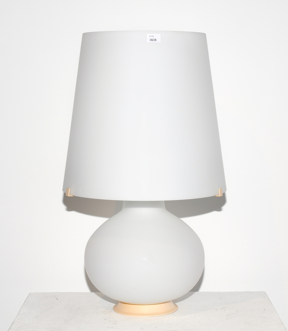 Tischleuchte Fontana, 1954. Ausführung Fontana Arte, Italien. Lampenkörper aus weissem, geblasenem und satiniertem Glas. Gebrauchsspuren. Guter Zustand. Funktionsfähig. H 53 cm.