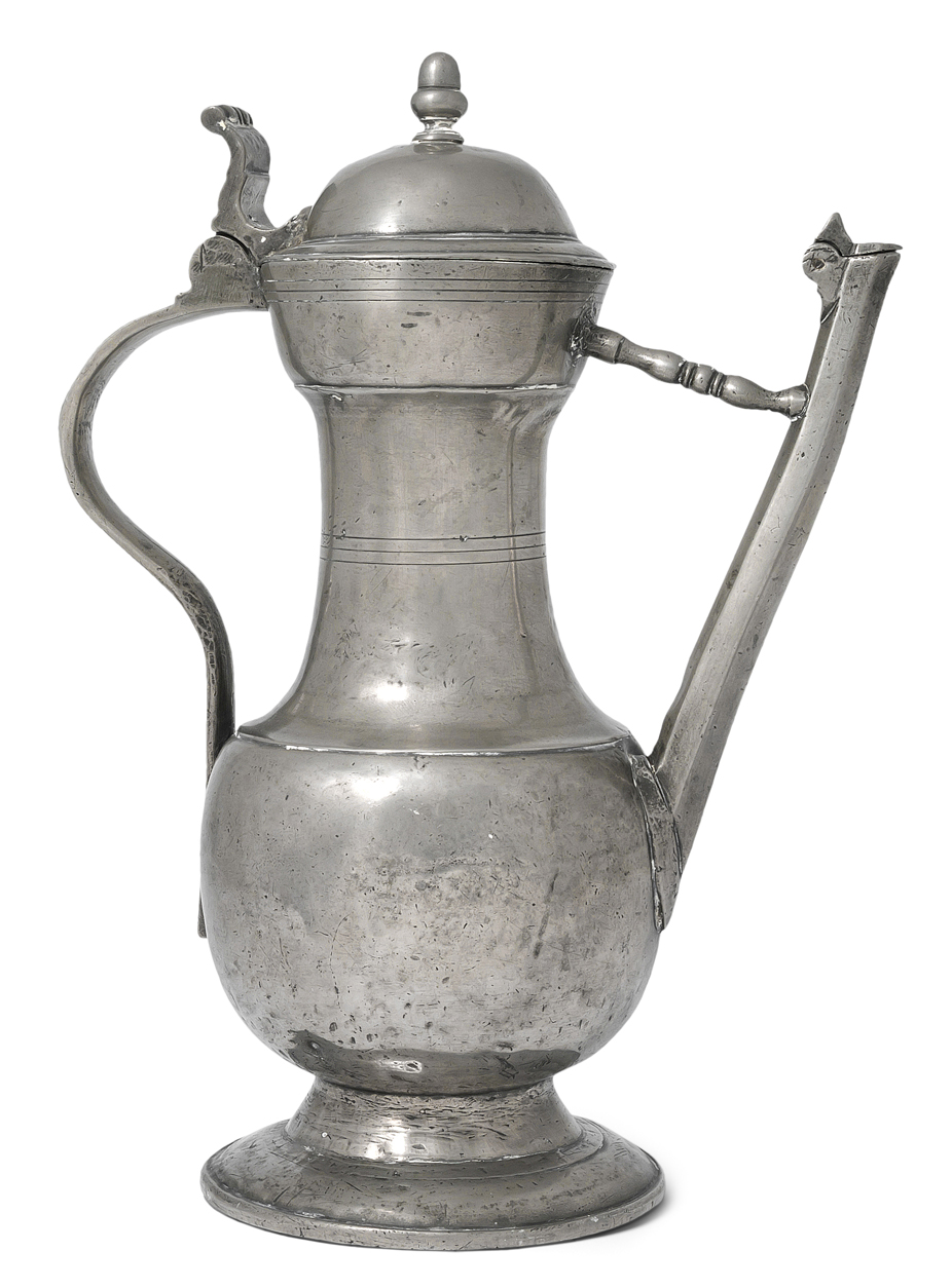 Vevey, Mitte 18.Jh. Zinn. Marke des Pierre-André Utin (erwähnt 1688–1771). Gewölbter Deckel mit Eichelknauf. Band als Drücker. Steg als profilierte Säule. H 33,5 cm.