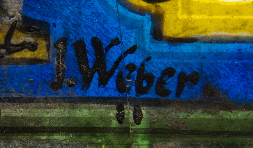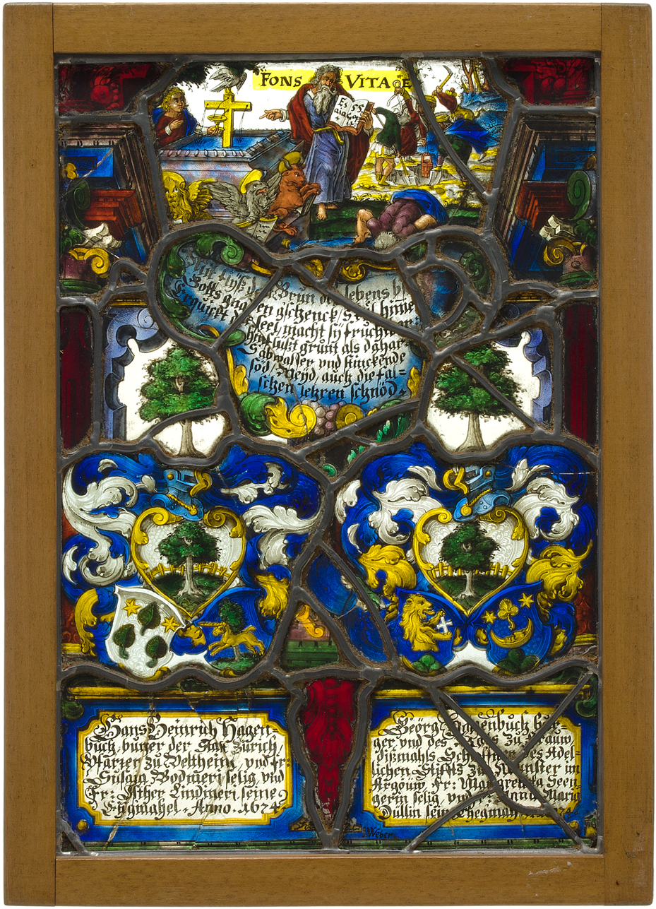 Schweiz, datiert 1674. Signiert "I.Weber". Jakob Weber II (1637–1685), Glasmaler aus dem Raum Zürich. Glas geätzt und polychrom bemalt. In Bleifassung. Mittelbild: Zwischen 2 Säulen die behelmten Wappen des Hans Heinrich bzw. des Georg Hagenbuch und ihrer Gemahlinnen. Oberlicht: Prophet Jesaja, umgeben von 3 Evangelisten-Symbolen sowie 3 Szenen zum Thema "Brunnen des Lebens". Kartusche mit Inschrift. Am Fuss 2 Inschriften und Jahreszahl. 30x20 cm. In Holzrahmen.