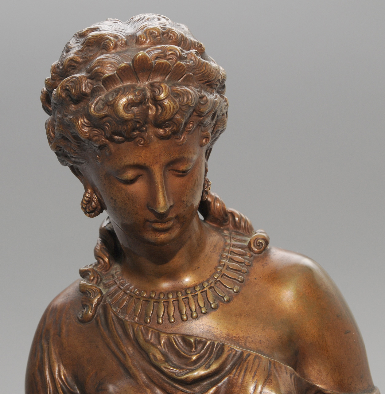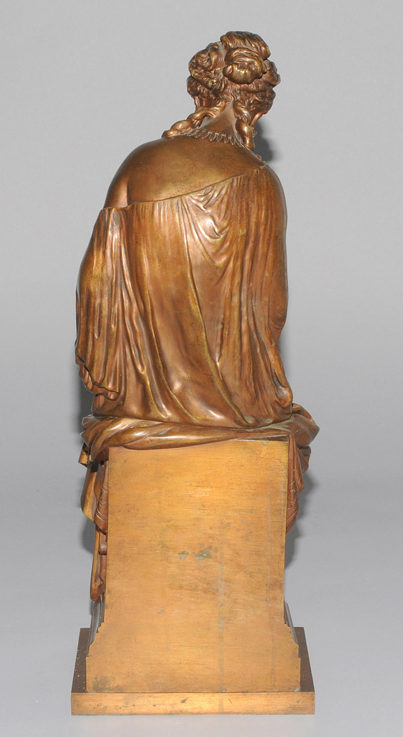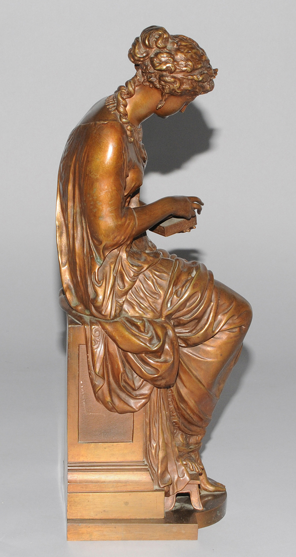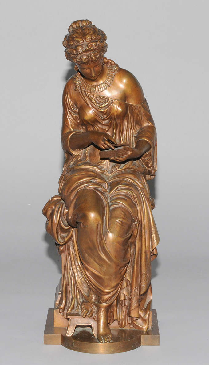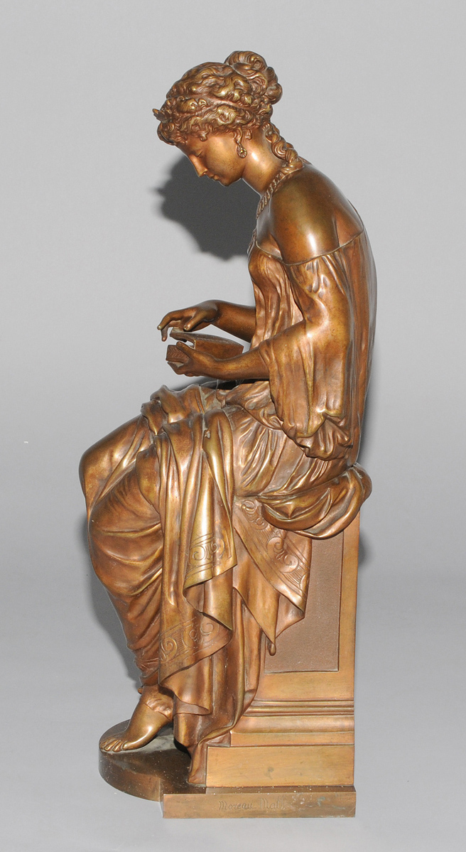 Mathurin Moreau (1822–1912). Bronze mit rötlich-brauner Patina. Auf Postament sitzende Pandora in faltenreichen Gewändern mit Haar-, Ohr- und Halsschmuck. Sie öffnet den Deckel des Kästchens, das sie in den Händen hält. Auf Sockelplatte bezeichnet: "Moreau Math". Giesserbezeichnung: "E. COLIN & Cie". H 53 cm.