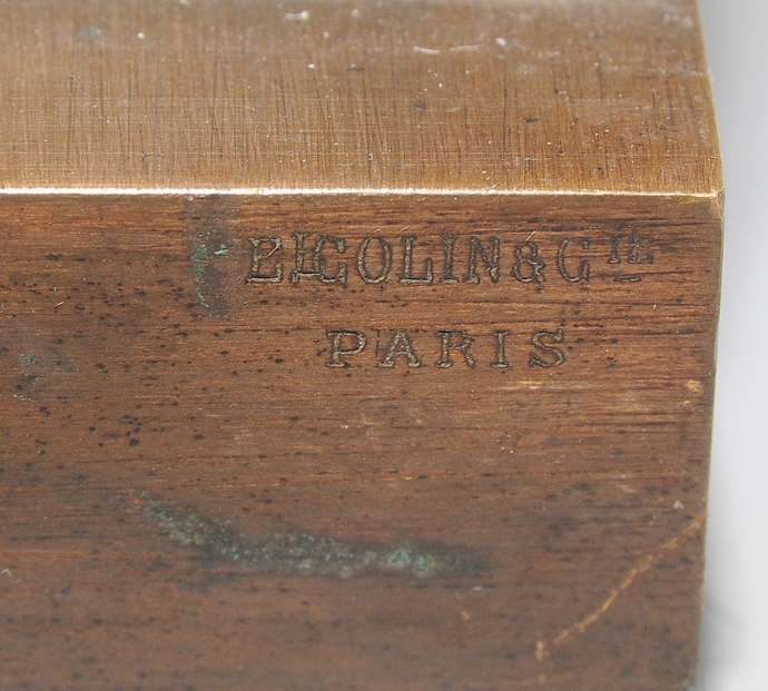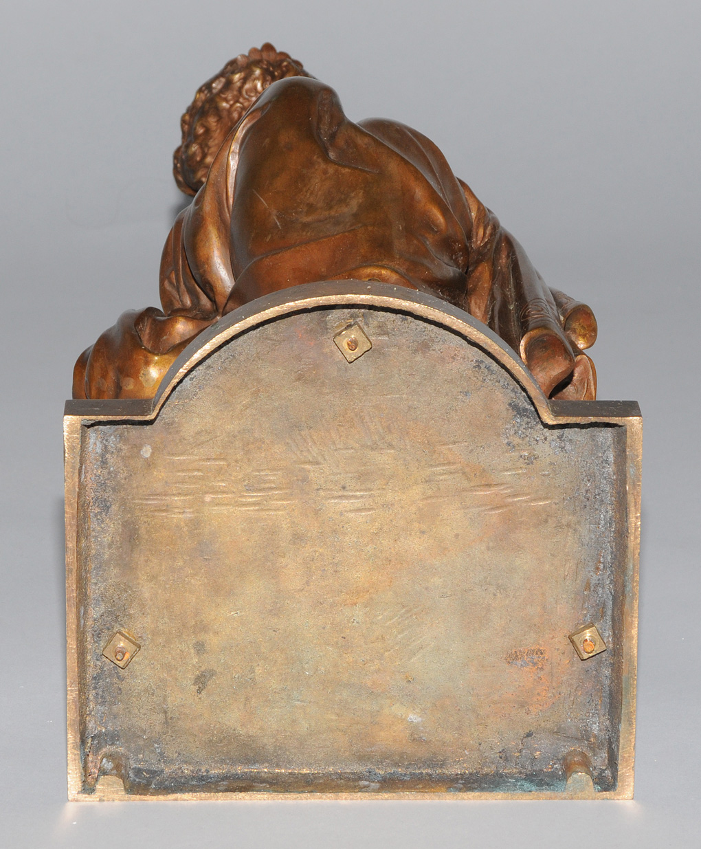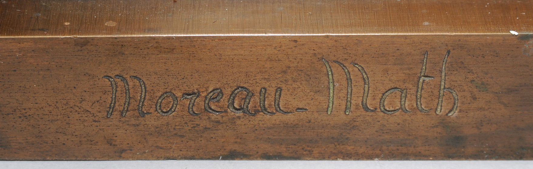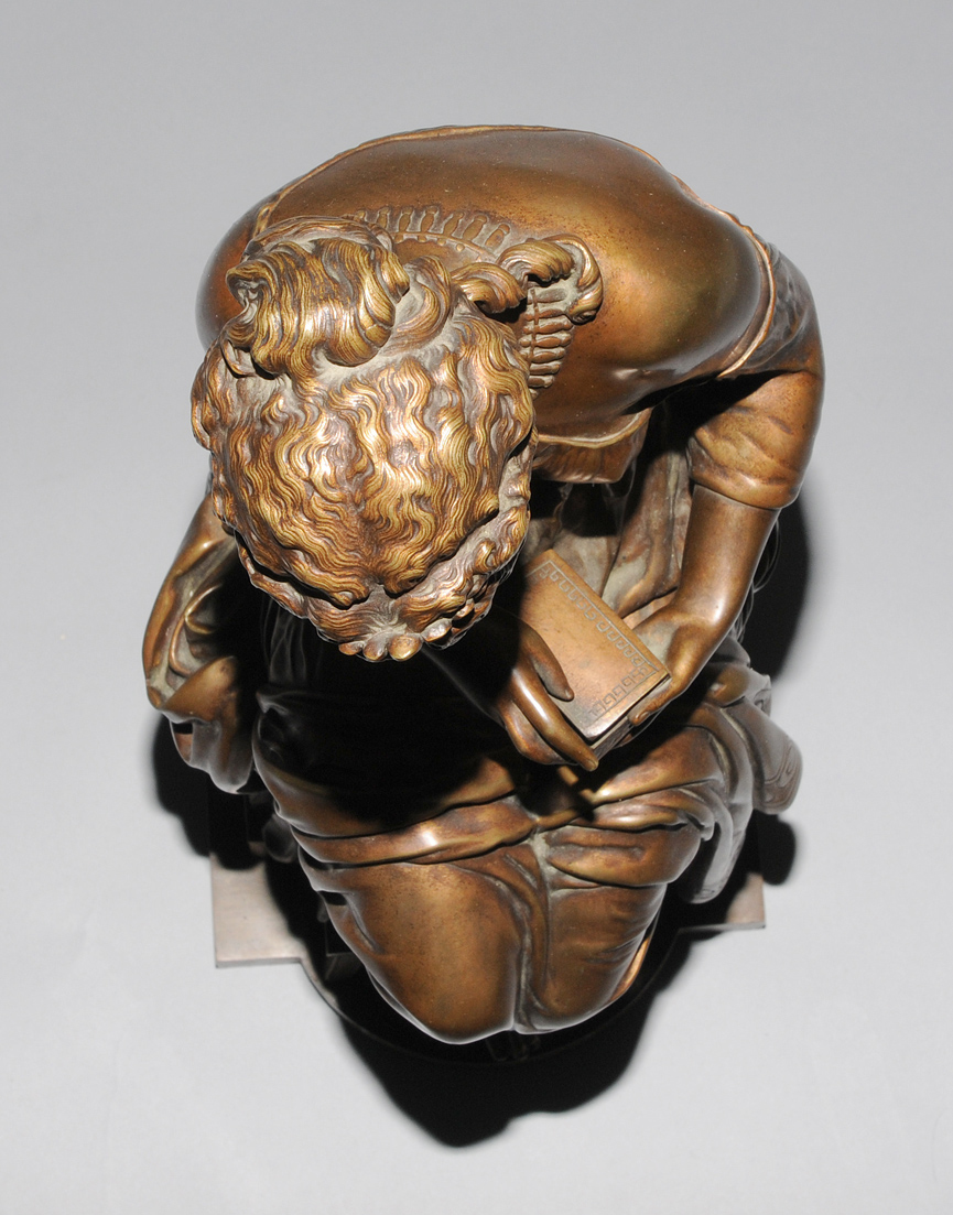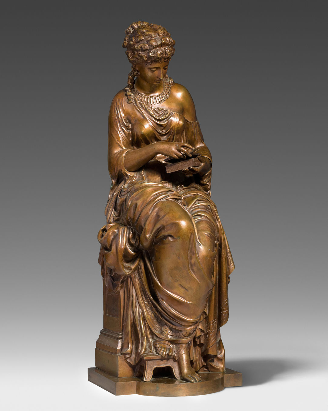 Mathurin Moreau (1822–1912). Bronze mit rötlich-brauner Patina. Auf Postament sitzende Pandora in faltenreichen Gewändern mit Haar-, Ohr- und Halsschmuck. Sie öffnet den Deckel des Kästchens, das sie in den Händen hält. Auf Sockelplatte bezeichnet: "Moreau Math". Giesserbezeichnung: "E. COLIN & Cie". H 53 cm.