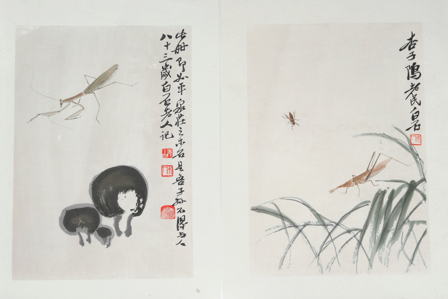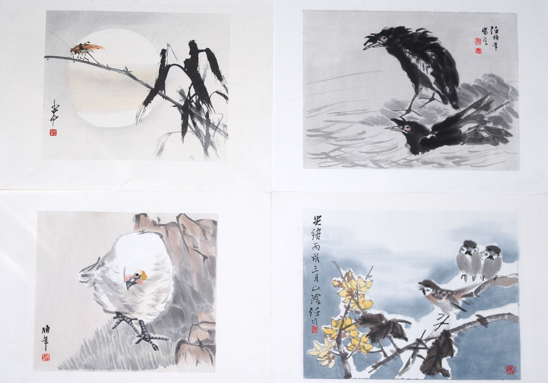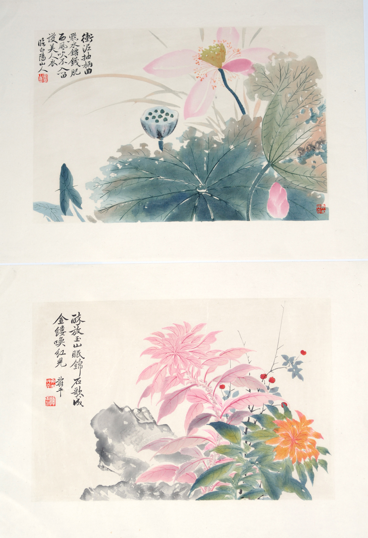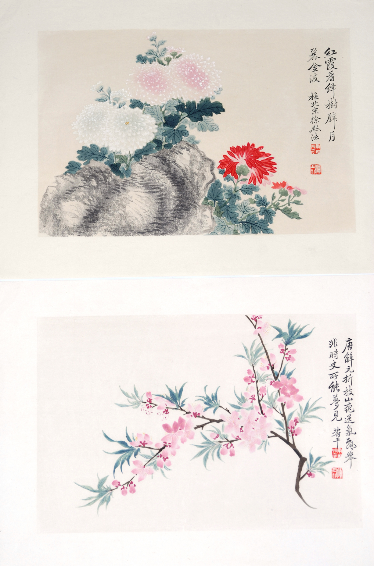 China, 20.Jh. Insgesamt 14 Blätter mit Blumen-, Insekten- oder Vogeldarstellungen von verschiedenen Künstlern wie Ren Bonian, Qi Baishi sowie vier Drucke nach Yun Shouping. Zwei Blätter aufgezogen. 42,5x32–50x36,5 cm.