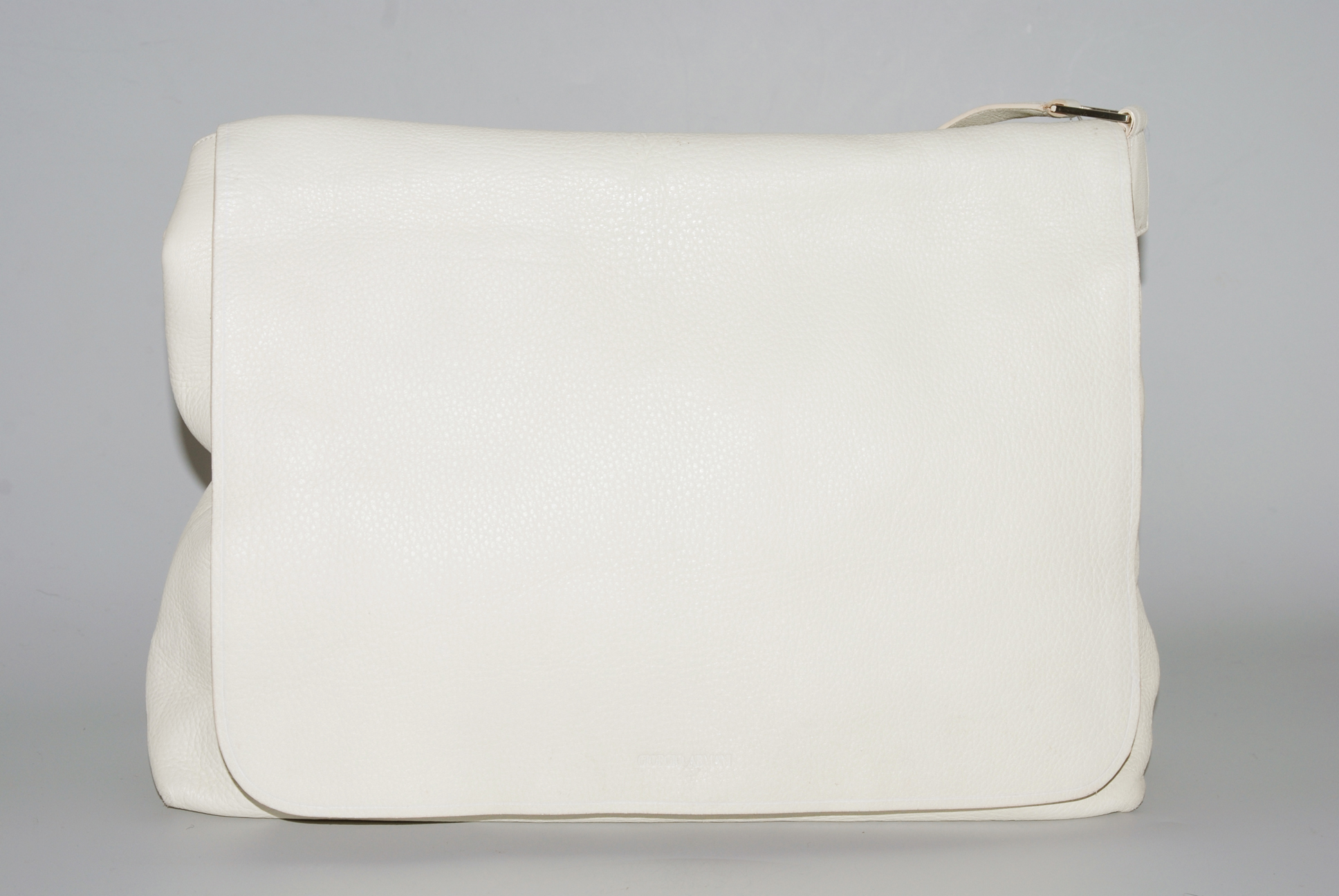 Weiches, weisses Leder. Trageriemen. Grosser Überschlag. In Original-Schutzbeutel. 44x30x10 cm. Leicht fleckig, sonst guter Zustand.